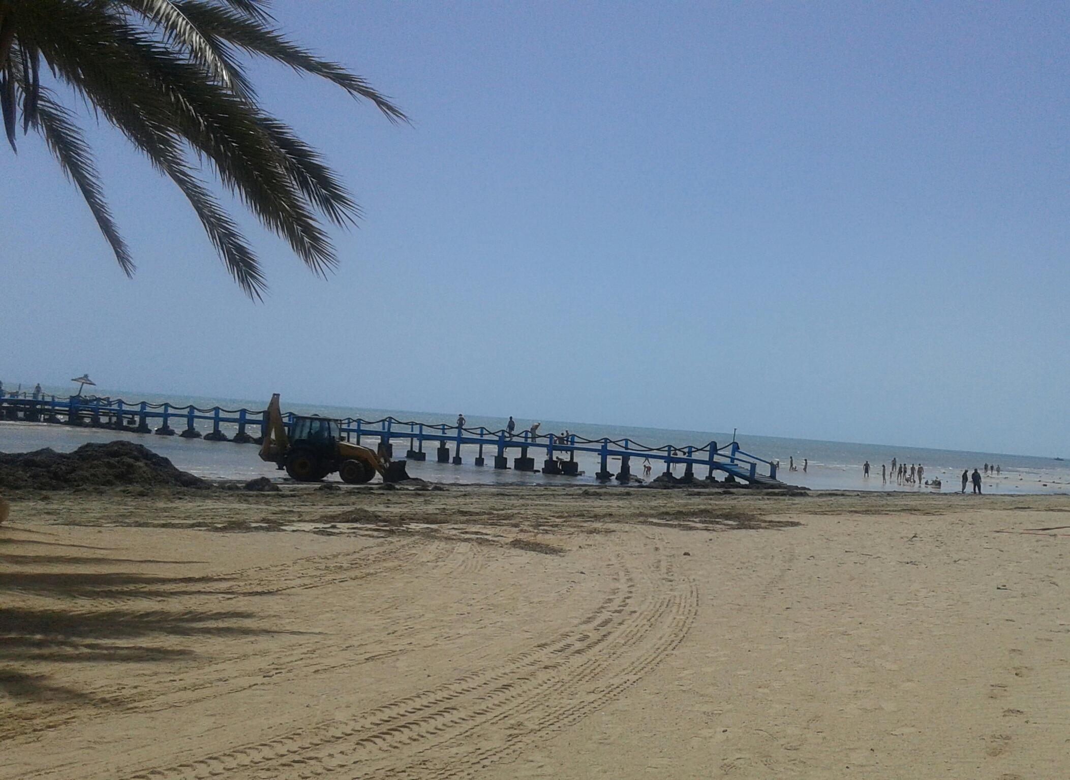 Вчера был жуткий шторм. Песок несло с моря на всю территорию отеля. Сегодня тракторы убирают пляж от водорослей(