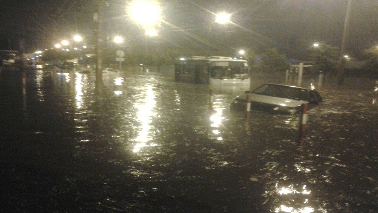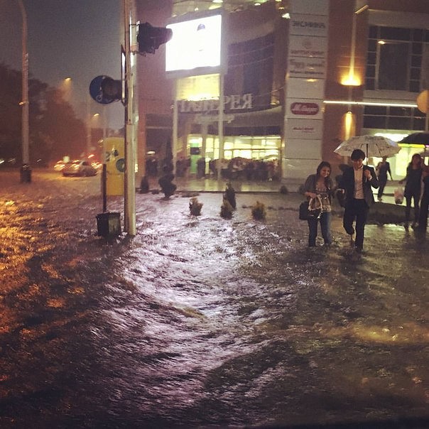 Потекло все из-за линёвки, которая не справилась с такими объемами воды. Текло с последнего этажа вниз. Вода перла и со всех прочих щелей, типа: унитазы, дренажные отверстия в полу. Акварель пострадала, в нее вода просто заливалась через парадные входы, ведь она находится в низине. Такой ливень, который был вчера, наверное первый за N-количество годов предшествующих 2016 году, и больше смахивает на тропический, хотя бы по достаточно весомым и объемным по содержанию воды каплям.