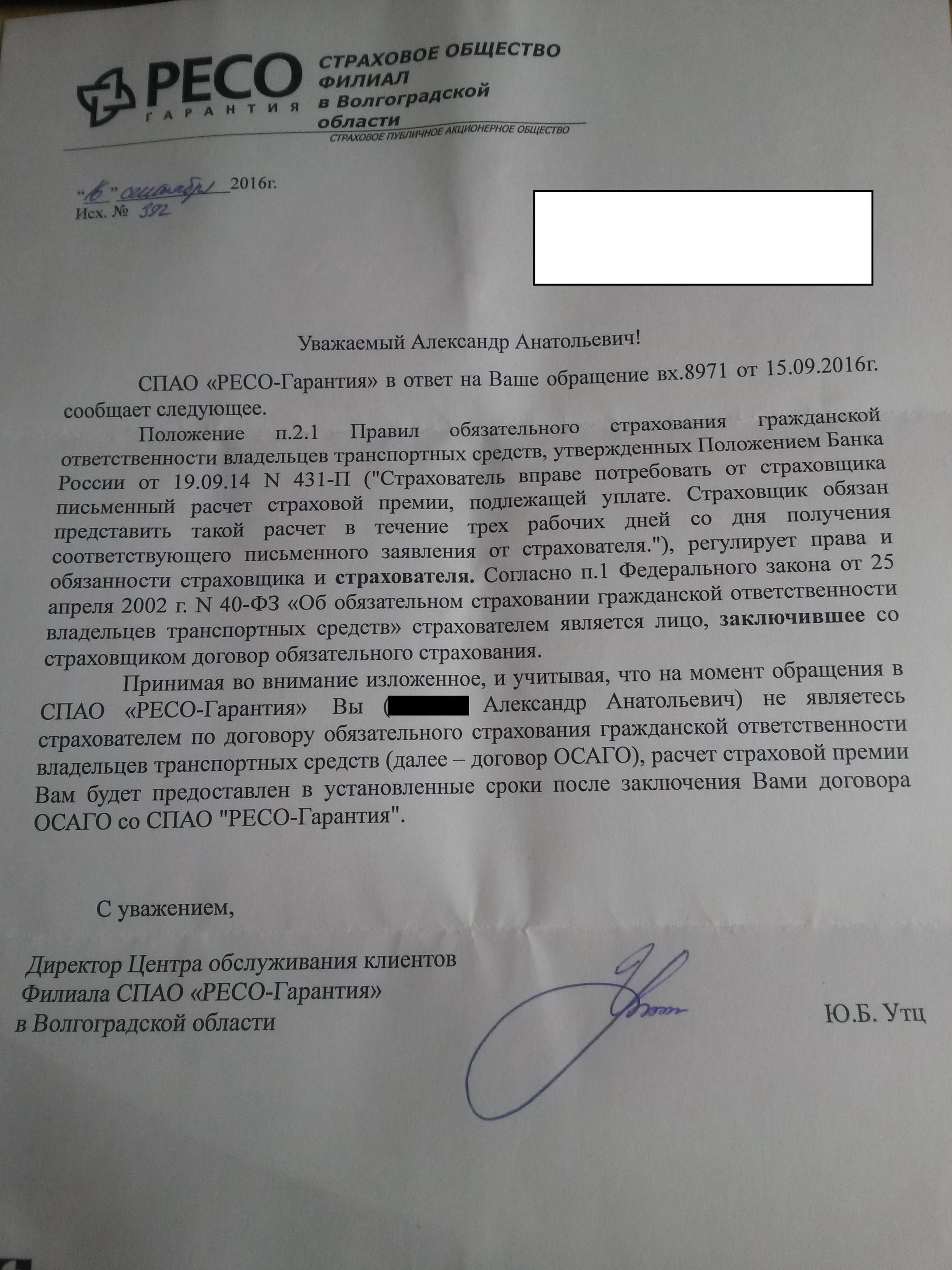В конверте от меня было Заявление Прошу Вас произвести письменный расчет страховой премии, подлежащей уплате, для заключения с Вашей страховой компании договора ОСАГО на срок действия с 15.10.2016г по 14.10.2017г. Также, при необходимости осмотра тс с вашей стороны (согласно правилам ОСАГО Глава 1 п. 1.7), готов предоставить тс к осмотру. В случае если в течение трех рабочих дней, со дня получения этого заявления, мне не будет предоставлен письменный расчет страховой премии, буду вынужден обратиться в контрольно-надзорные органы (Центральный банк РФ, ФАС, РСА), для привлечения Вас к ответственности по статье 14.1 ч.3 КоАП РФ На основании абз.5 п.2.1 "Положения Банка России №431-П" Прошу уведомить меня по телефону 0000000 о готовности письменного расчета страховой премии, чтобы я смог приехать и получить письменный расчет на руки в офисе Вашей компании по адресу: 400010, Волгоград, проспект Маршала Жукова д.94 Д К заявлению прилагаются следующие документы: 1. Заявление о заключении договора ОСАГО (Приложение 2 к Положению Банка России от «19» сентября 2014 года №431-П) на 3 листах. 2. Копия свидетельства о регистрации транспортного средства; Серия 0000 № 00000. 3. Копия диагностической карты: № 4. Копия ВУ на имя Александра Анатольевича: Серия 00000 № 00000. 5. Копия паспорта (собственника тс) Александра Анатольевича: Серия 000 № 0000. 6. Копия паспорта ТС: Серия 000 № 0000 7. Копия предыдущего договора ОСАГО от ООО"РОСГОССТРАХ": Серия ХХХ № 000005.
