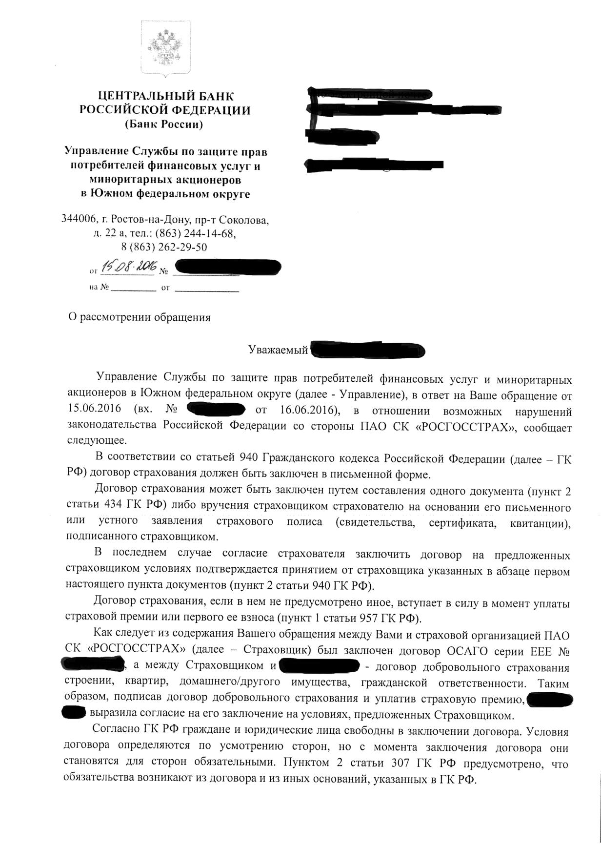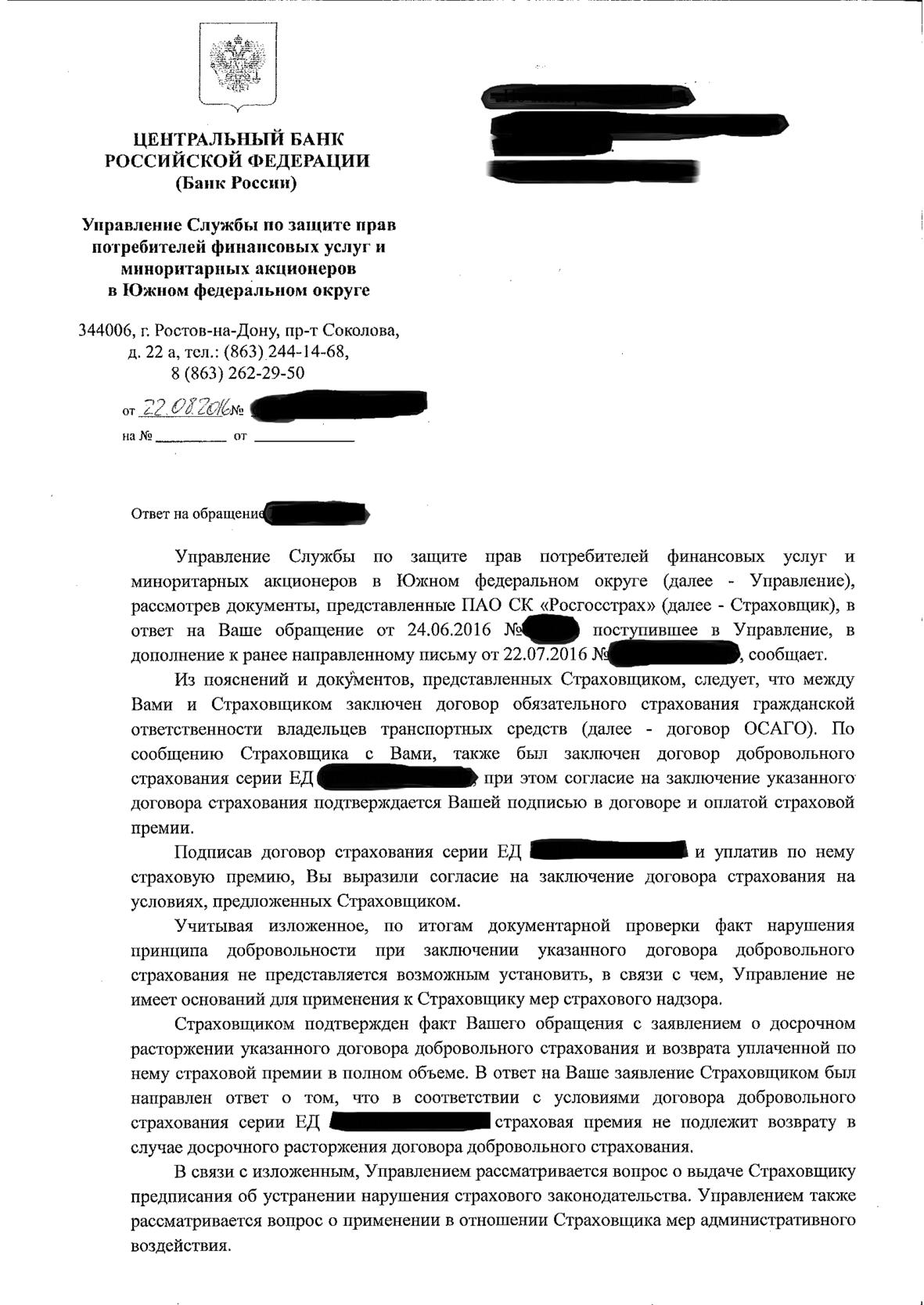 Так как тема " Осаго. Диверсия Росгосстраха" была закрыта, отпишусь здесь. Я уже писала, что РГС отказался возвращать деньги за доп. страховку. Написала жалобы в ЦБ и комитет по защите прав потребителей получила ответы