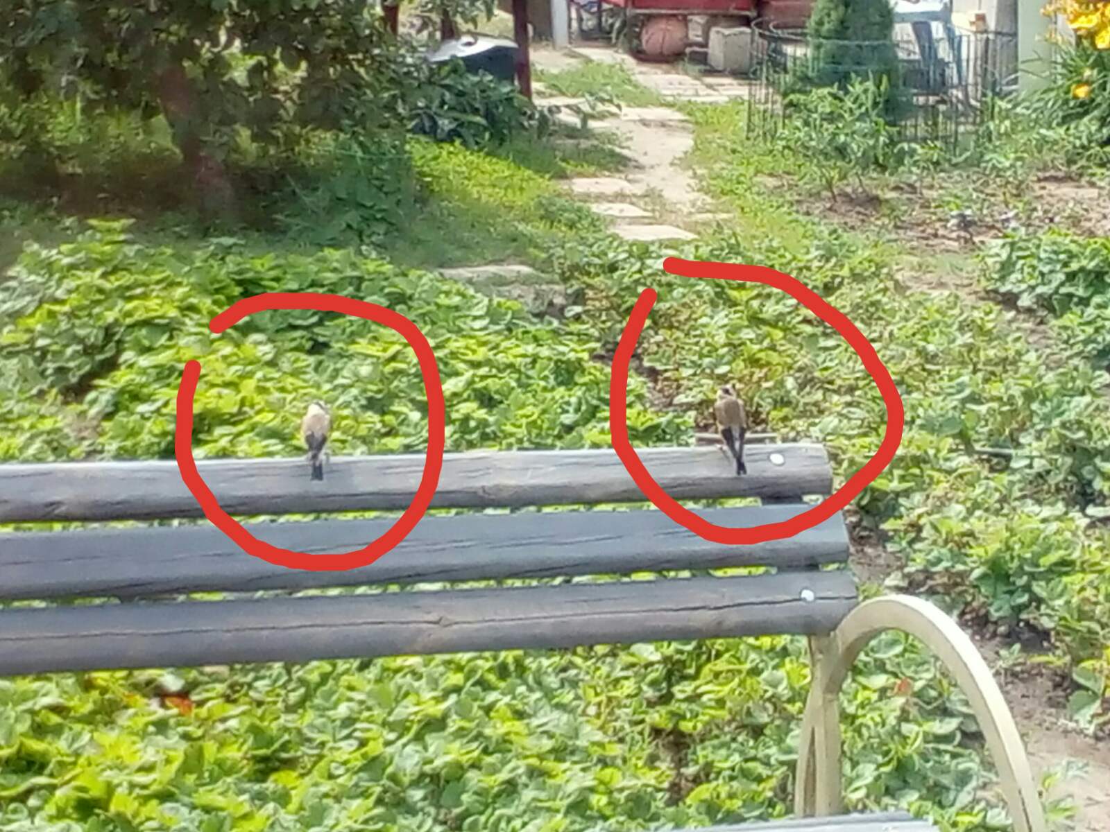 С утра в огороде птичий галдёж. На скамейке видим пару щеглов. По очереди садятся в кусты клубники. Оказывается там их птенец. Видимо первый выход из гнезда. Пытается летать. Отнесли его за двор, там заросли терновника, и скорее всего их место жительства, т.к. взрослых щеглов наблюдаем около месяца. Очень красивые птички. И щебечут приятно. Кошка тоже хотела полюбоваться птичками (услышала их галдёж), но её заперли в комнате. ЗЫ: после того, как пару лет назад купили сыну бинокль, книгу про птиц и повесили кормушку для них, узнали, что у нас обитают не только воробьи и ласточки. Наблюдали птиц: синицы, лазоревки, зеленушки, дубоносы, щеглы, сорокопут-жуланы, мухоловки-пеструшки, трясогузки, удоды, дятлы.