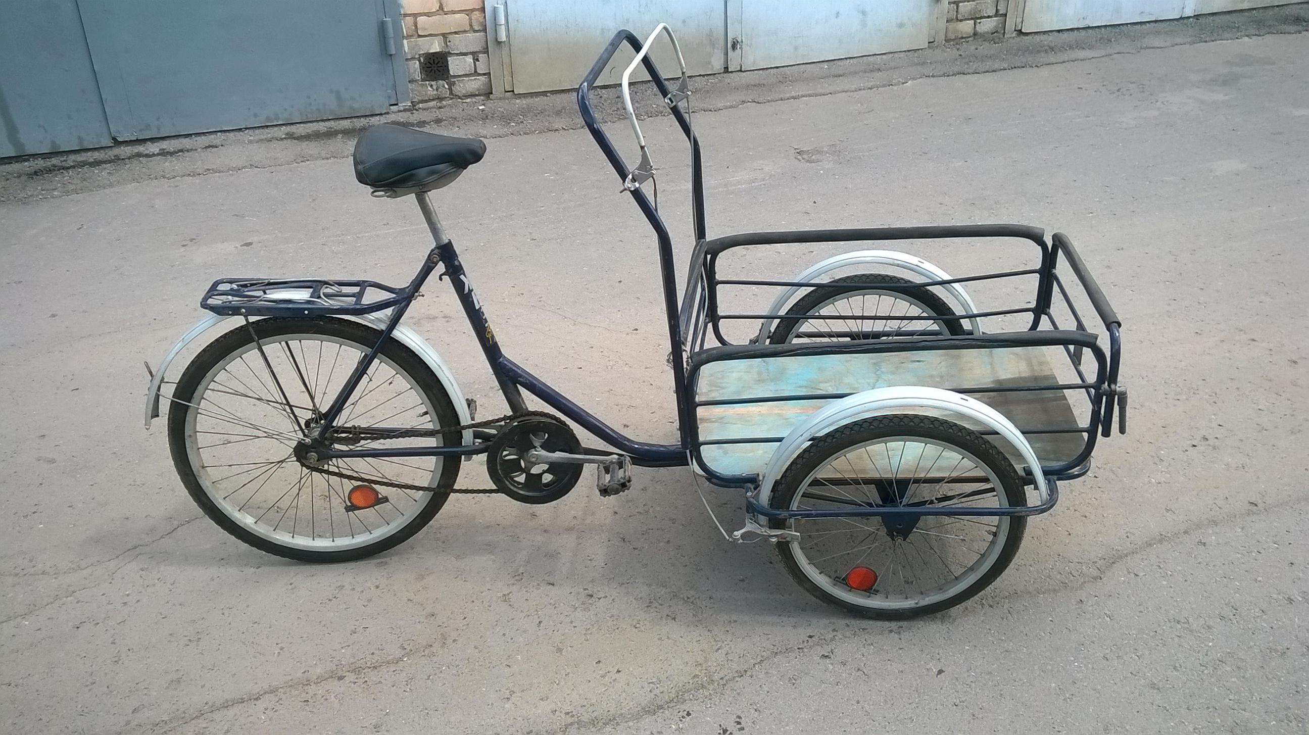 Разбирая мусор в гараже обнаружил свой грузовой велосипед. Ну, то есть он там давно стоит, но в этот раз напомнил о себе. Накачал колеса, собрал и покатался по гаражу, вспомнил молодость. Вот и подумалось, может нужен кому? Обменяю на денежные знаки. Количество и номинал можно предлагать здесь. Покупали в середине 90-х, активно использовали несколько лет в процесс перевозки овощей и фруктов с дачи до дома и рынка. Потом, в связи с приобретением автомобиля необходимость в нем отпала и велик ушел на ПМЖ в гараж. В корзину помещается 4 советских ведра, передняя часть открывается, но необходимости в этом нет - всё отлично ставится сверху. Из косяков - помятое левое крыло, отсутствует задняя катафота. Требуется провести небольшое ТО - натянуть цепь, починить правый передний тормоз, возможно смазать трущиеся детали.