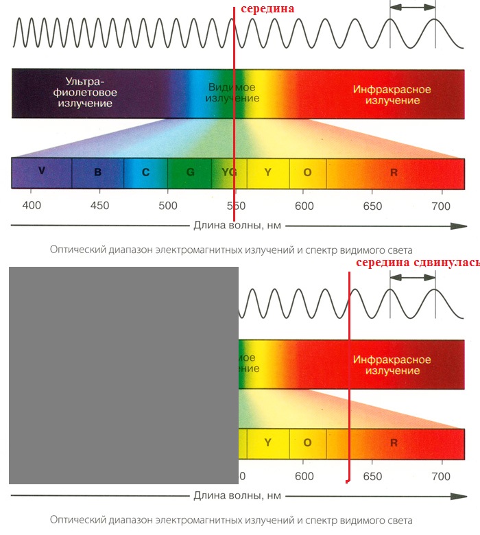 сдвигает длинную волну в сторону видимого спектра, верно, желтые линзы сдвигают видимый спектр в сторону более длинных волн, принцип один и тот же
