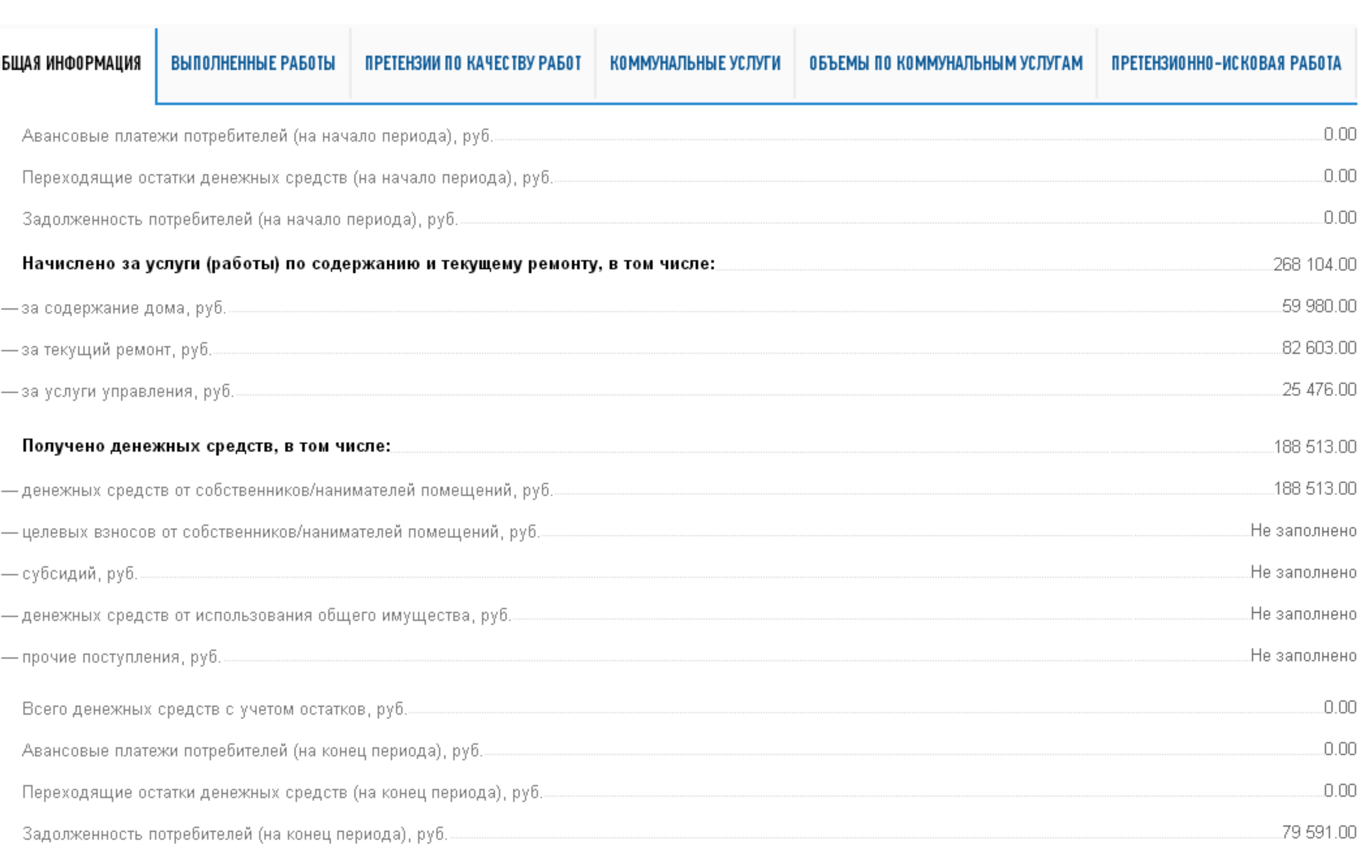 https://www.reformagkh.ru/myhouse/profile/finance/7699019/ вкладка "Выполненные работы" ---------- Сообщение добавлено 17.08.2016 13:32 ---------- Из отчета того же дома Маресевой, 15, где не указано о фактах выполненных работ за второе полугодие 2015г : Начислено за услуги (работы) по содержанию и текущему ремонту, в том числе: 268 104.00 за содержание дома, руб. 59 980.00 за текущий ремонт, руб. 82 603.00 за услуги управления, руб. 25 476.00 Получено денежных средств, в том числе: 188 513.00 денежных средств от собственников/нанимателей помещений, руб. 188 513.00 целевых взносов от собственников/нанимателей помещений, руб. Не заполнено субсидий, руб. Не заполнено денежных средств от использования общего имущества, руб. Не заполнено прочие поступления, руб. Не заполнено Всего денежных средств с учетом остатков, руб. 0.00 Авансовые платежи потребителей (на конец периода), руб. 0.00 Переходящие остатки денежных средств (на конец периода), руб. 0.00 Задолженность потребителей (на конец периода), руб. 79 591.00 --- т.е., начисленно, получено, работ 000000000000, на следующий год переходит 00000, остатков 00000. Где деньги, Зин?