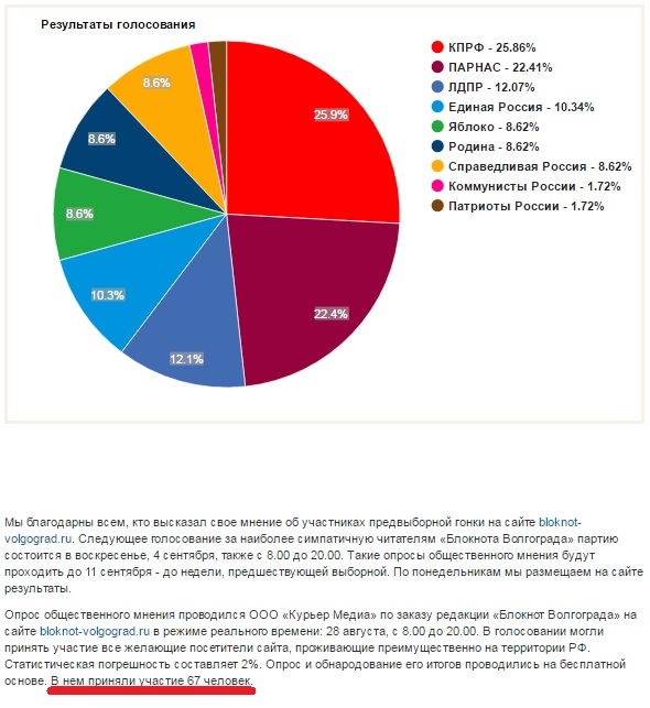 Подробнее: http://bloknot-volgograd.ru/news/7-partiy-otchayanno-boryutsya-za-pyaterku-liderov--774983 В опросе приняли участие 67 человек!!!!!!!!!! Это очень показательный опрос с учетом: Ну да ладно, будем считать что голосовали сотрудники ООО «Курьер Медиа» и «Блокнот Волгограда». Интересно другое: голоса всех составляют 100% / 67 человек принявших участие в опросе = 1,49% составляет голос одного проголосовавшего. Запоминаем: один проголосовавший = 1,4925% два 2,985 % три 4,4775 % четыре 5,97% пять 7,4625 % шесть 8,955% А вот теперь интересно узнать, как у блокнота получились данные цифры: Яблоко - 8.62% Родина - 8.62% Справедливая Россия - 8.62% Коммунисты России - 1.72% Патриоты России - 1.72% Знаем что голосовало всего 67 человек. Волшебство! Или, таки проголосовало, аж 58 человек, что делает результаты еще более значимыми и отражающими реальное положение дел в стране/области/городе (выбирайте нужное). 22,41% за ПАРНАС это круть!