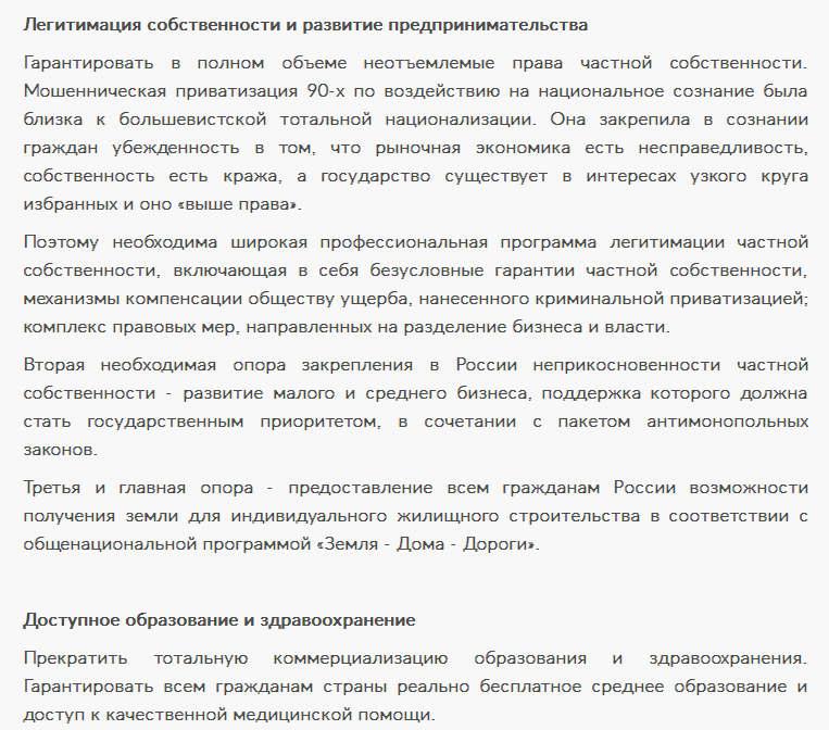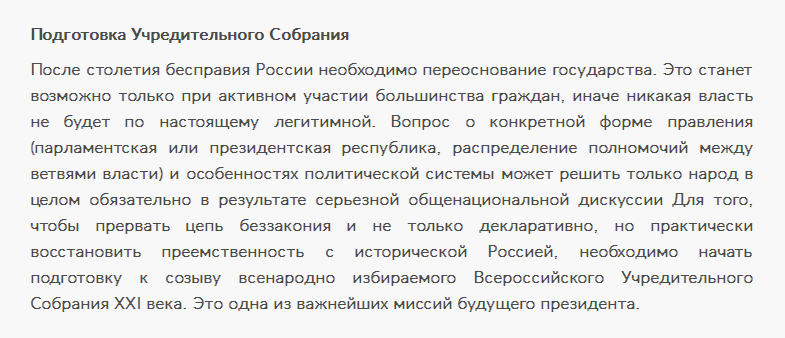 а я бы нет. Похоже у Явлинского тоже развивается ПГМ. Думаю нормальный человек хотел бы видеть программу решения экономических вопрос, а не всякие декоммунизации, свободы слова и прочую ерунду, которые мы в 90-е слышали. Да и как возможно примирение в обществе, если он отрицает большевиков и Сталина, к которым в нынешнем обществе у немалого количества людей положительное отношение. Опять же, учредительное собрание. Кто помнить историю, тот знает чем закончилась работа этого органа