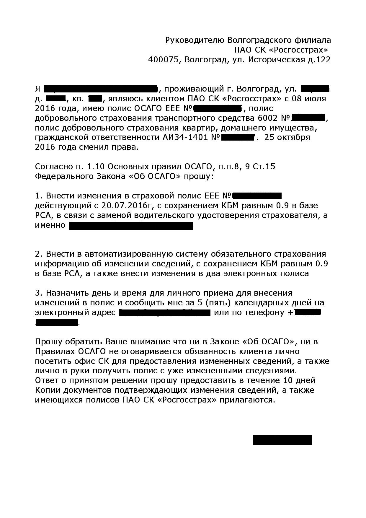 3. Выслать два полиса с измененными сведениями на бумажном носителе по почте заказным письмом на адрес указанный в данном обращении, либо назначить день и время для личного приема для получения полисов на бумажном носителе с измененными сведениями и сообщить мне за 5 (пять) календарных дней на электронный адрес………. или по телефону ………..