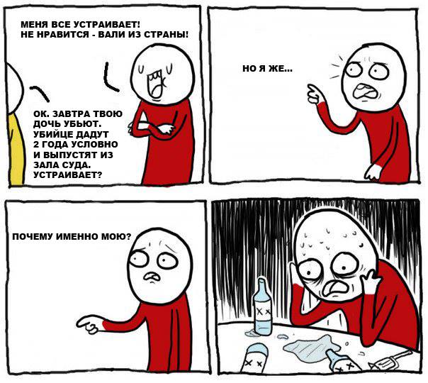 Содержимое нижеприведенной статьи актуально и для местного форума. Ники называть я не собираюсь. Кому дано, то поймет в чей адрес направлено данное послание. Просто вот реально выбешивают подобные персонажи. И кричат они громче всех, и пишут больше всех. "Частенько слышу от людей – «Меня все устраивает. Не устраивает – вали из страны». Что хотел бы им сказать? Ребят. Поверьте, вас все устраивает до первого бум. До первого опоздания скорой на час, когда у родственника инфаркт. До первой бутылки шампанского в вашей заднице, в полицейском участке. До первого подкинутого наркотика. До первого неправомерного решения в суде, когда убили вашего родственника, а преступника отпустили на свободу. До первого избиения в сизо вертухаями, если вы туда попали. До первой фразы – «Такие операции в России не делаются. Летите лечиться в Израиль». Короче до первого сбоя в хорошей жизни. До первого – «обезболивающего нет»! Я знаю, что начинают делать люди, попавшие в такую ситуацию. Писать: «ВНИМАНИЕ РЕПОСТ! Помогите распространить информацию. Давайте предадим огласке этот беспредел». Поверьте мне. То же самое начнете делать и вы. Вас будет сильно возмущать – «Как это так? Я же такой весь из себя хороший! Это случайность. Недоработки на местах». Как это так? Как это так? А вот так, ребята. Дело не в том, кто хороший, а кто плохой. Дело в системе, которой вообще на это плевать. Она так устроена. Чтобы поймали и наказали преступника – надо выйти скопом людей и разгромить торговый центр. Чтобы отдали пенсию – написать лично Грефу. Чтобы получить качественное лечение – устроить сбор денег через СМС на первом канале. Чтобы наказать зарвавшегося полицейского – предать его действия огласке, закидав соцсети мольбами о репосте. Для того, чтобы вам вернули украденные деньги за долевое строительство – перекрыть федеральную трассу! Все. Только так и по-другому эта система НЕ РАБОТАЕТ. Точка. И дело не в том, что я вам этого желаю. Дело в том, что любой человек может оказаться в такой ситуации. Парадоксом в данном случае является то, что никто не вспоминает, своих же слов «МЕНЯ ВСЕ УСТРАИВАЕТ». И не вспоминает, что были в стране правозащитники, а теперь они – НКО. Бац и их нет. Был комитет против пыток – теперь НКО. Бац и их нет. Были такие ребята как я, которые выходили на митинги и требовали менять систему. Но вы им настойчиво говорили – вали из страны. Бац и они уехали. И заметьте. Те, кто уехал не хотел никаких революций, которыми вас пугали из телевизора. Это тоже парадокс. На ровном месте из страны выдавливают и уже выдавили тех, к кому вы в первую очередь могли бы обратиться за помощью. Тех, кто пытался изменить систему, чтобы не они, не вы не оказались в такой ситуации. Человек, говорящий сегодня «Меня все устраивает» на мой взгляд – человек недалекий. Не думающий о будущем. Не просчитывающий вариантов. Живущий сегодняшним днем. По сути – человек без будущего. А какое будущее ждет страну, если в ней живут люди без будущего?.. Читать полностью: http://yablor.ru/blogs/menya-vse-ustraivaet/5106689