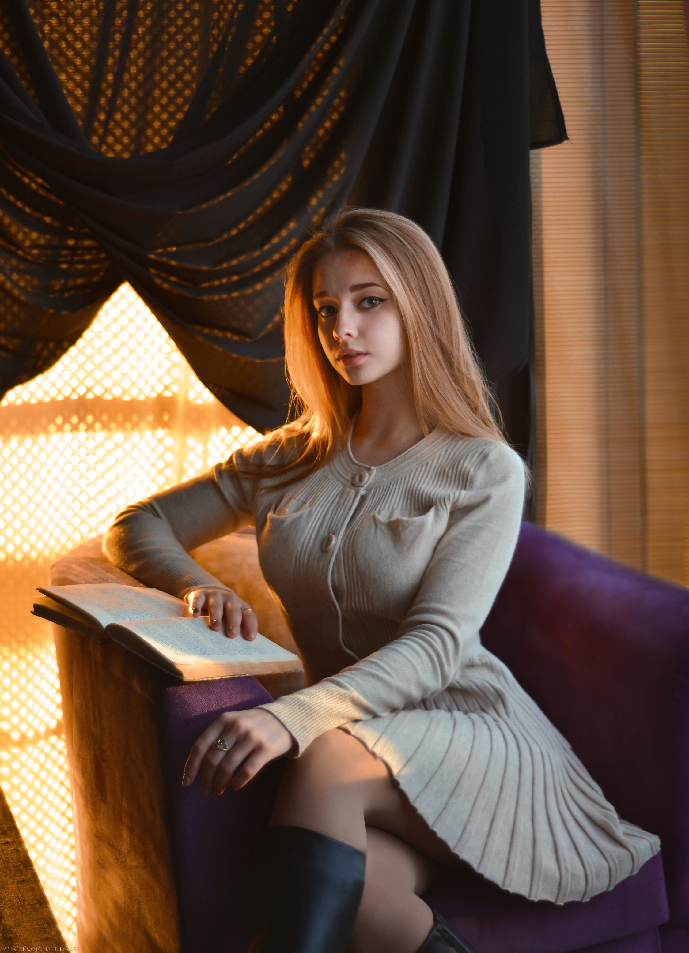 При съемке в студии есть ряд правил, сформированных не только теоретическими выкладками, но и многолетним опытом. Чтобы нарушать эти правила надо разбираться в теории и иметь БОЛЬШОЙ положительный опыт съемки ПО ПРАВИЛАМ. А ты хочешь и правила нарушать, и на теорию чихать. Так никогда не получишь хороших результатов. И добавь: следи за фокусом, чтобы он не был на ушах-макушке-свитере и т.д., как например на девушке выше. Открытой дырку можно оставлять лишь в случаях, когда этого позволяют свойства объектива. 50/1,8Д - не лучший полтинник в этом смысле, так зачем же издеваться. Несколько примеров с аналогичными твоим условиями, только со вспышкой. Открытая диафрагма (1,4), большое яркое окно сзади. EXIF сохранен.