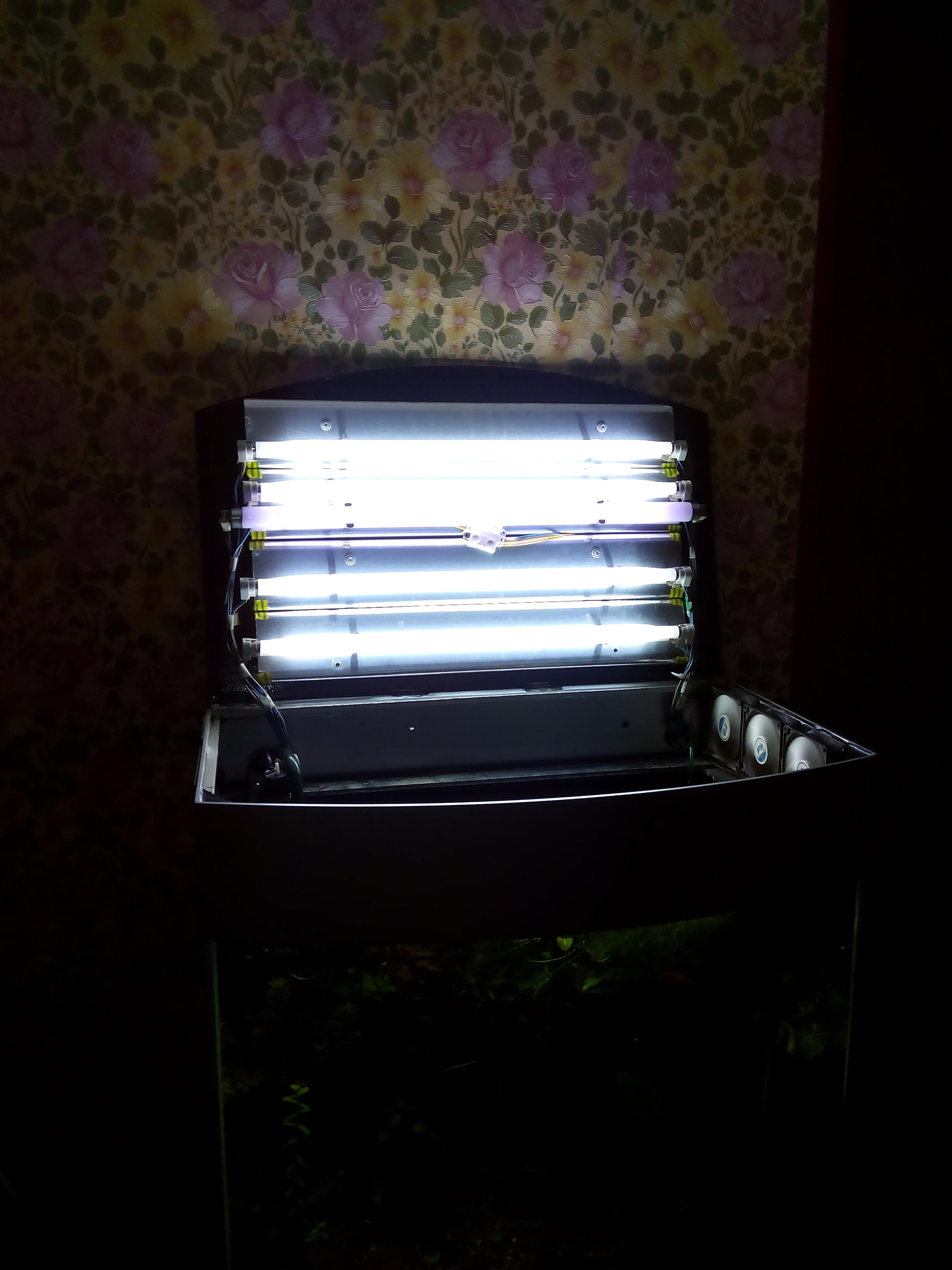 продаю панорамный аквариум 120 л,надёжная самодельная тумба(проведена электрика с защитой и автоматикой света),крышка из акрила со светом для разогнанного травника(4 лампы т5 24вт сильвания 6500к,одна лампа т8 био),три встроенных куллера для охлаждения крышки,внешний фильтр джебо 835(требуется замена трубок подачи воды и кранов,всё есть на птичке,цена вопроса 500р),две грелки 200 и 50вт.рыбы,креветки,улитки и очень много растений в подарок.продаю потому что не хватает на него времени. форумчанам отдам за 5500. 89I7-832-I233