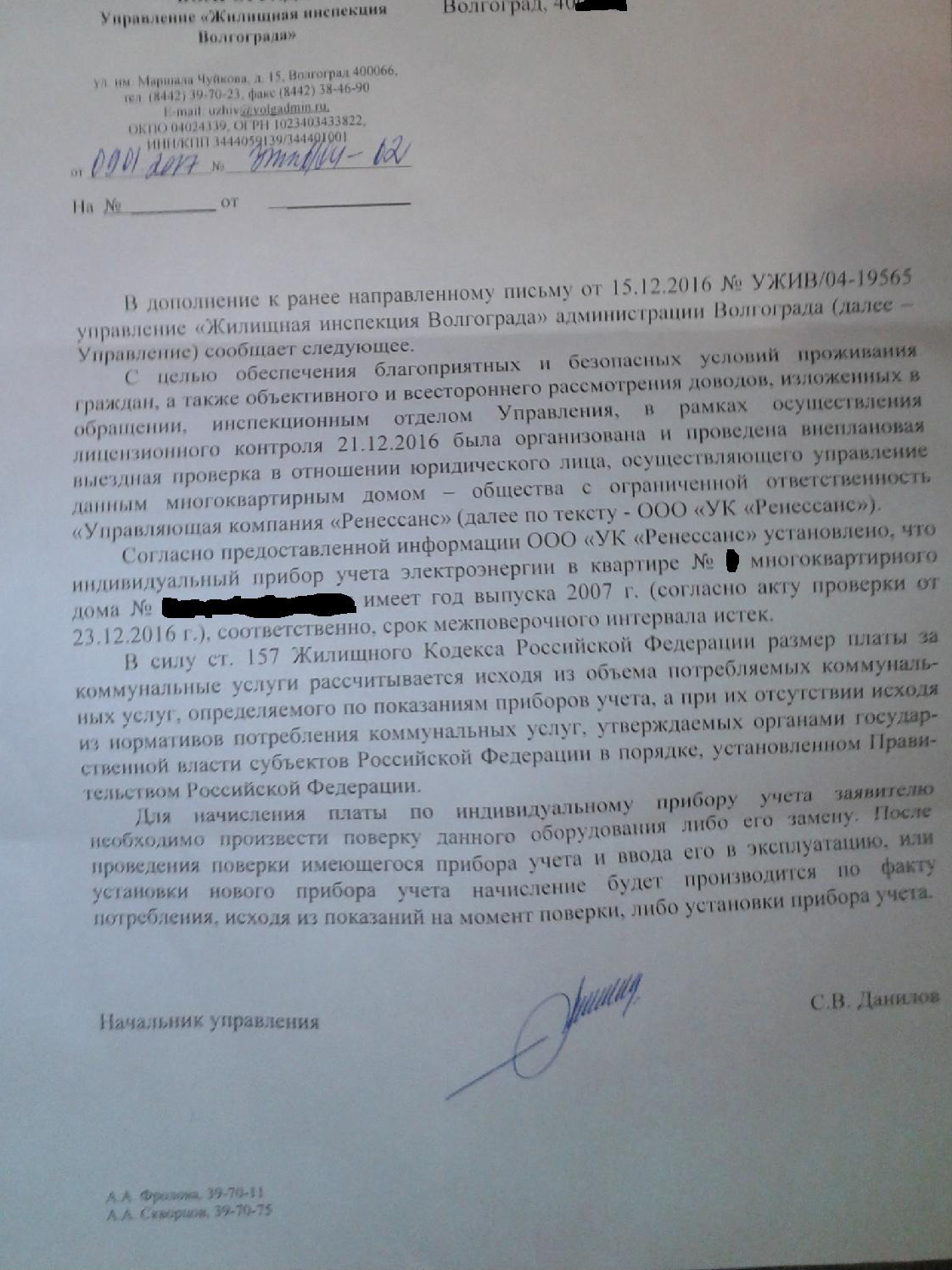 запросто. У родствеников имеется внутриквартирный электрощёчик. Он, согласно цифрам на лицевой панели и паспорту имеет год выпуска-2010 и межповерочный интервал 16 лет. Однако УК Ренесанс произвела осмотр щёчика, составила акт осмотра и без каких-либо на то оснований указала в акте что щёчик имеет почему-то год выпуска 2005 год, предоставленный паспорт на него, где указан год выпуска -2010 попросту проигнорировала, сделала вывод что этот щёчик требует поверки и поэтому непригоден к учёту. По заявлению в жилинспекцию прибыли её представители, посмотрели этот щёчик еще раз, составили еще один акт где указали что год выпуска уже другой -2007 и написали ответ который я выложил. Т.е это выглядит как издевательство на пустом месте. Вот я и хочу узнать, куда теперь написать жалобу. Похоже, работники УГЖИ глумятся над жильцами.