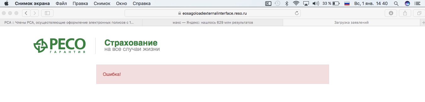 3 января: Росгосстрах перекидывает на сайт страховой ангара МАКС выкидывает на сайт страховой ангара В Ангаре (у которой нет представительства в Волгограде) - висит на стадии загрузки сканов документов Ресо дает заполнить все данные, а потом пишет что у них техническая проблема. на телефоне горячей линии говорят писать в техподдержку. там быстро отвечают и шлют в Ангару. ВСК висит вечная проверка данных в РСА