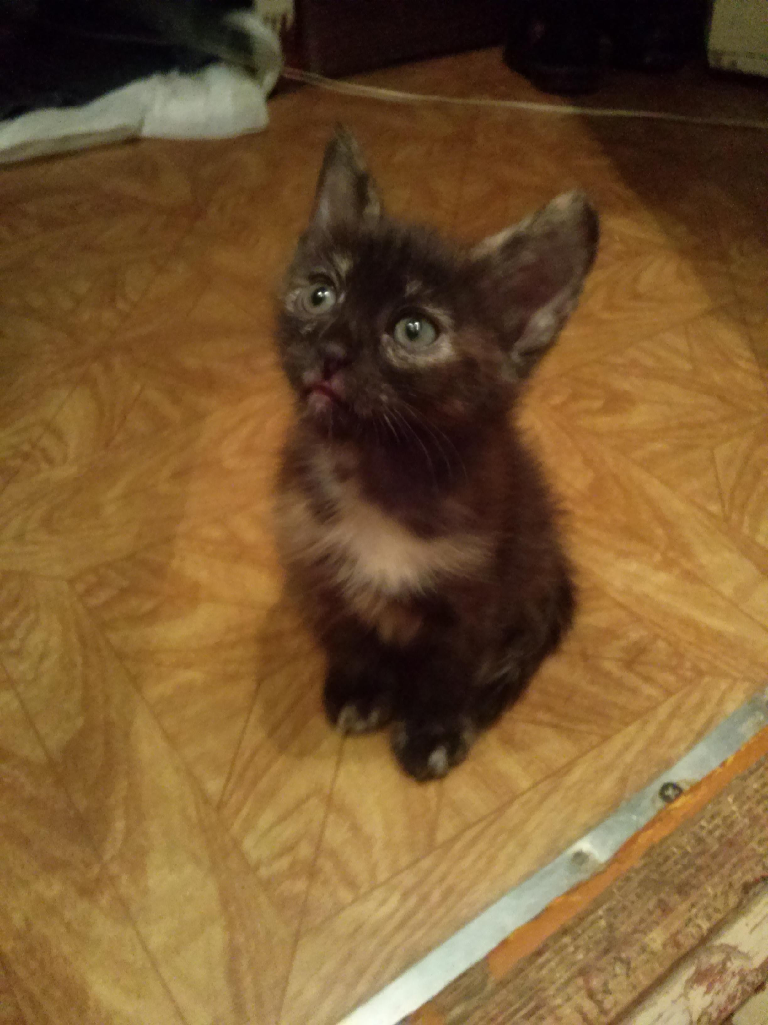 Было 4 котёнка, осталася одна девочка трёх цветная, ухоженная и упитанная, возраст 9 января был ровно месяц, котёнок от вИслоухой кошки, но котёнок ушастый как обычный. Смотреть и забирать на СХИ