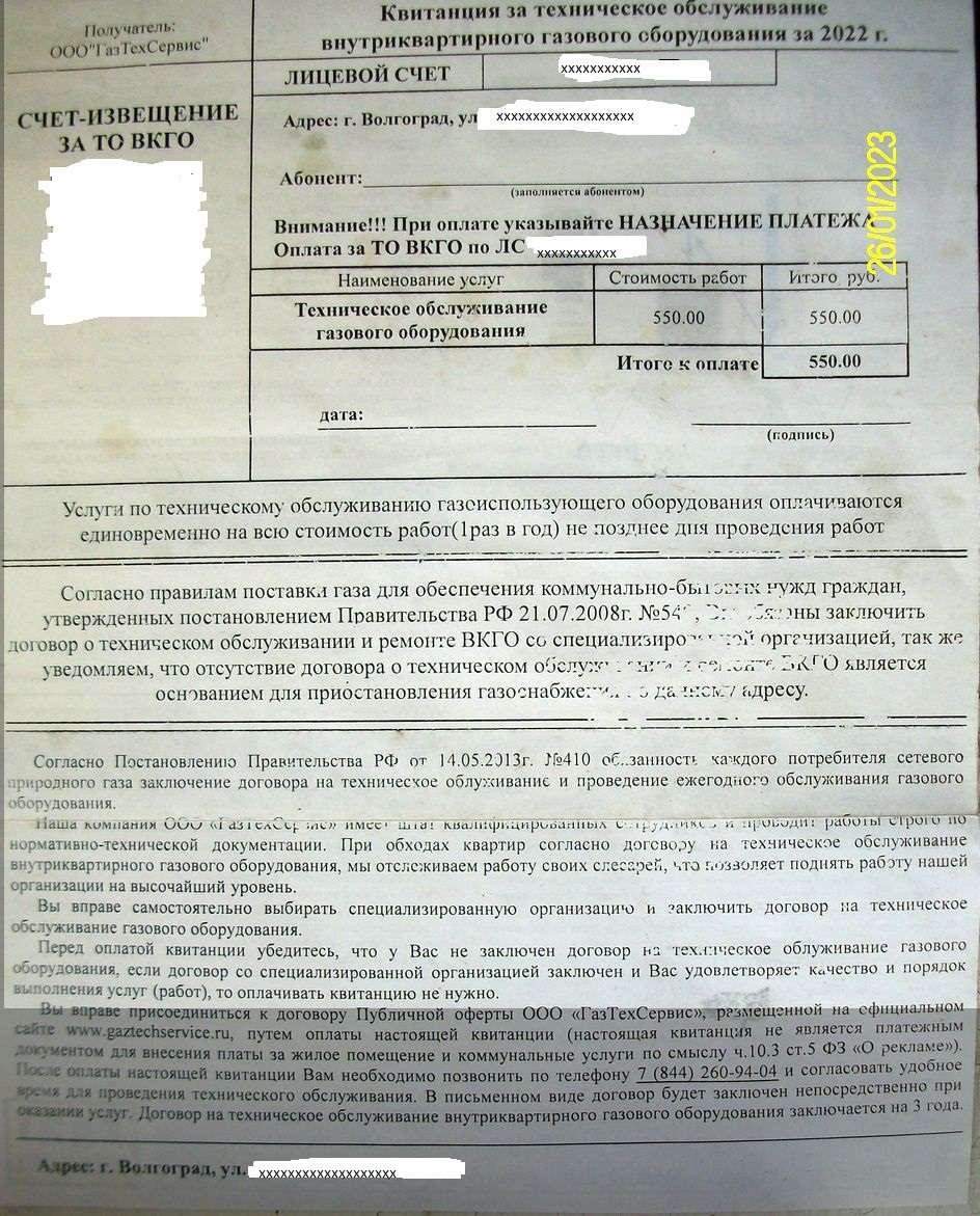 Сегодня приходил работник ВолгоградГоргаза. осмотрел плиту и трубопроводы на предмет утечек. Я показал квитанцию, которая пришла ранее. Сказал, что та квитанция от организации, которая не имеет отношения к горгазу. Хорошо, что я её не оплатил ранее. Я верю, что приходил работник именно горгаза. Он не требовал налички - у него был терминал для оплаты карточкой. Однажды нам приходилось встречать мошенников при замене счётчиков на воду. Тогда деньги брал наличкой, мошенница на телефоне на следующий день спрашивала, сколько мы ему заплатили. Явно они друг другу не доверяли. Тогда пришлось ещё раз вызывать представителей ресурсной организации, чтобы проверили счётчик. На фото квитанция от левой организации халявщиков, которая рассылает эти квитанции просто для сбора денег с лохов :-)) В любом случае, халявщиков и мошенников много. Будьте бдительны.