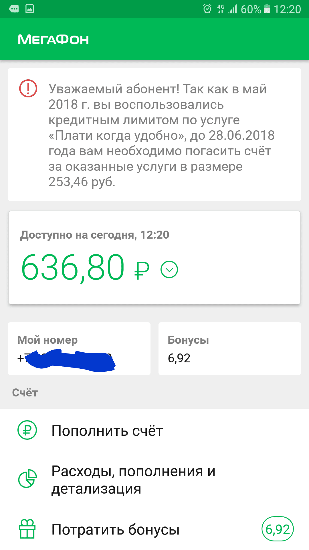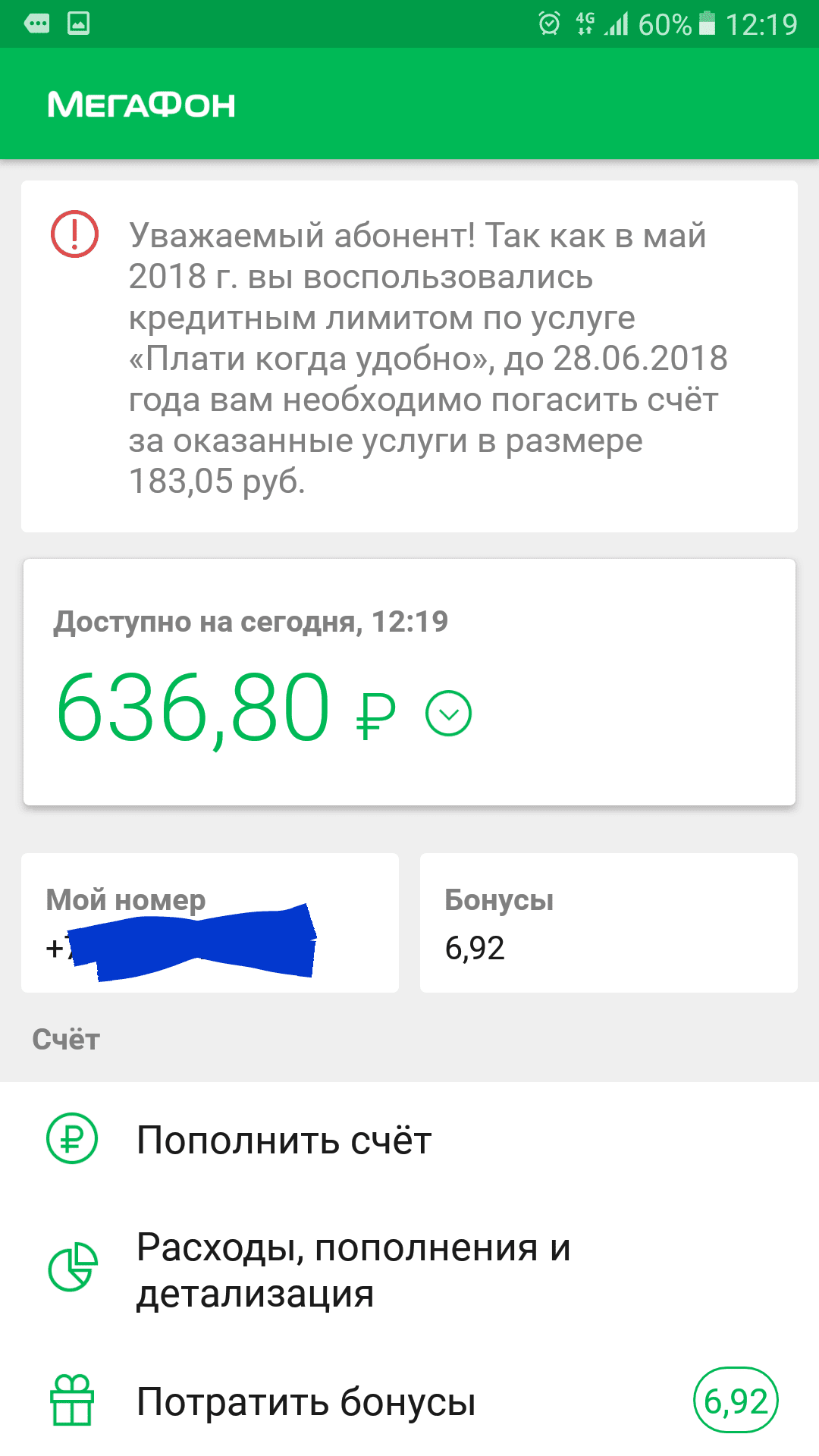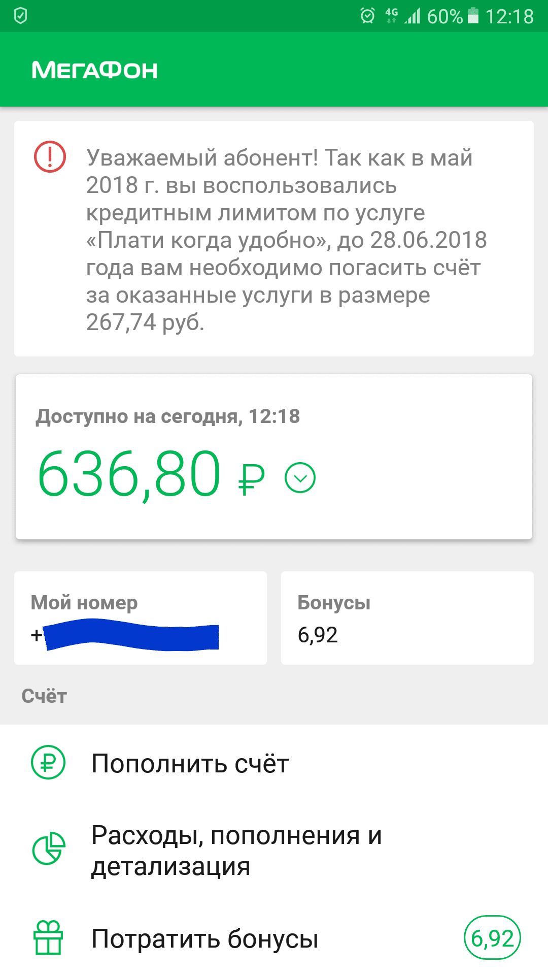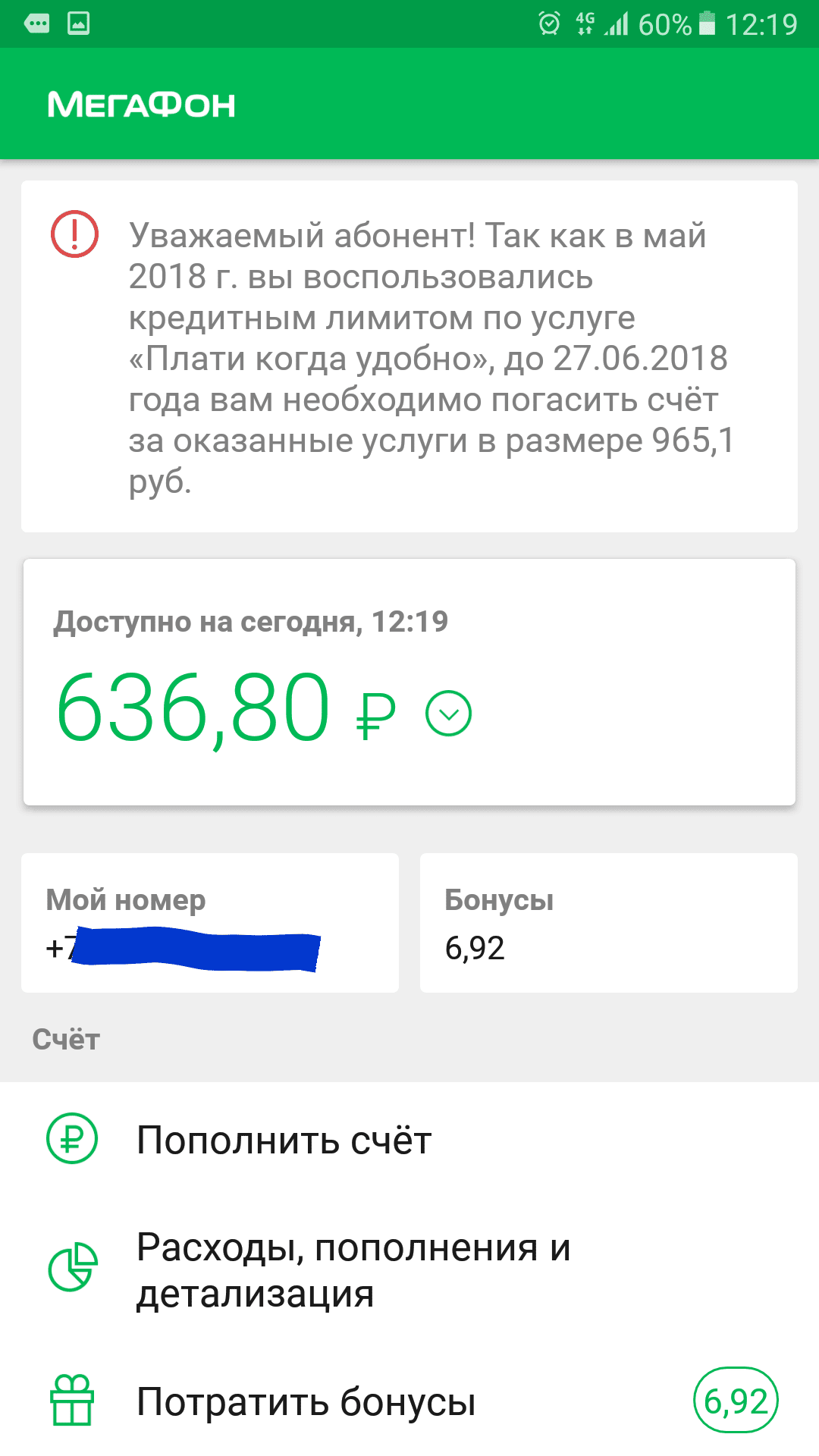 подключился к бесплатной опции "плати когда захочешь", прошел месяц и сеня при заходе в приложение появляется сообщение, что я должен 180р., засомневался, вышел-зашел из приложения и должен уже 250, снова зашел должен 950, потом 150, разные суммы за 2 минуты. При этом лимит мне не предоставлялся и даже если бы и был предоставлен, то по условиям предоставления опции это все бесплатно кроме суммы задействованного лимита. Если нажать продолжить, то появится сервис ввода номера карты и кода безопасности и тютю. Короч, на дурака идейка, будьте бдительны
