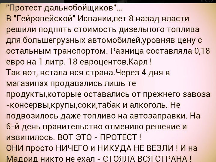 Это ж плохо. Обычному люду перекрывают дорогу. Они проехать не могут. Надо бастовать в поле, и за повышение! И всё согласовать))) тогда будет хорошо. Вообще тут говорили что письма надо писать в прокуратуру. Испания вообще Лохи, как вчера полицейские говорили народу. П.С. Я не одобряю безконтрольные вылазки кучи народу по городу, а методы против платона одобряю.