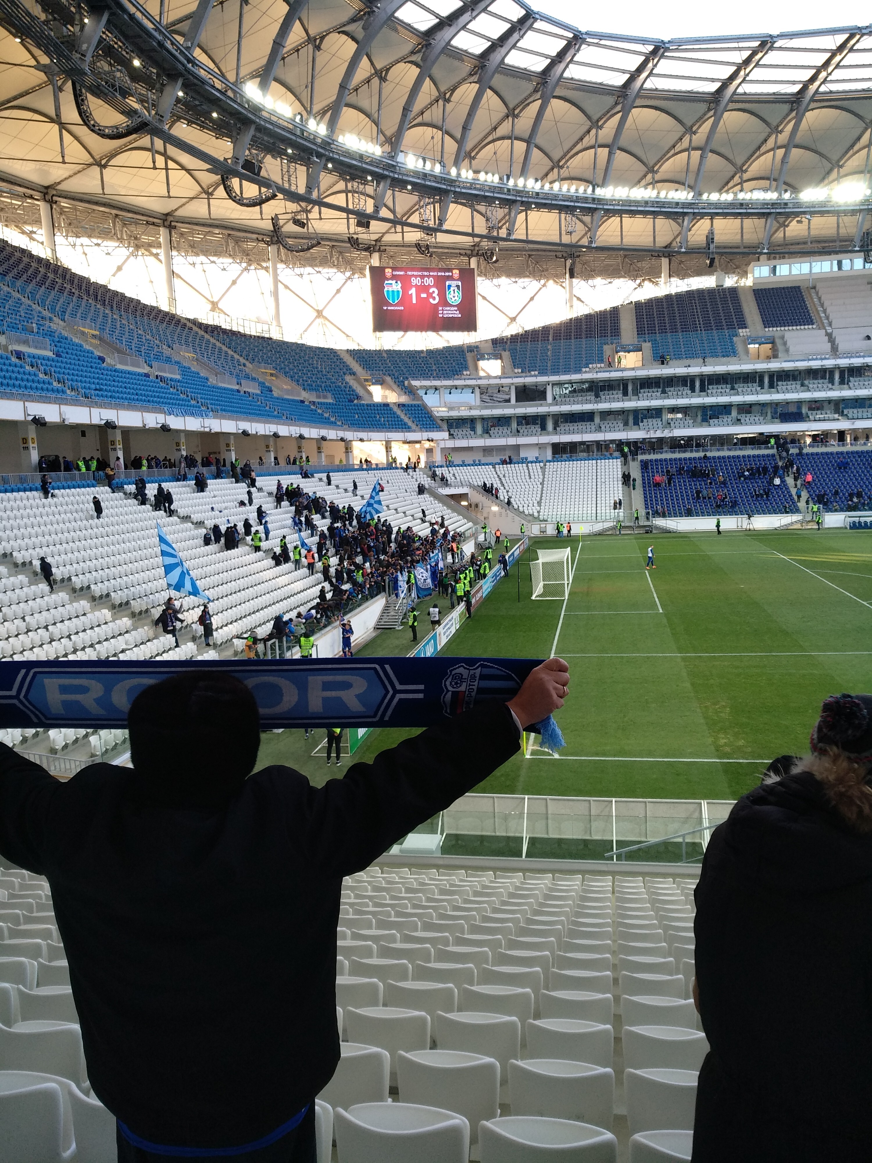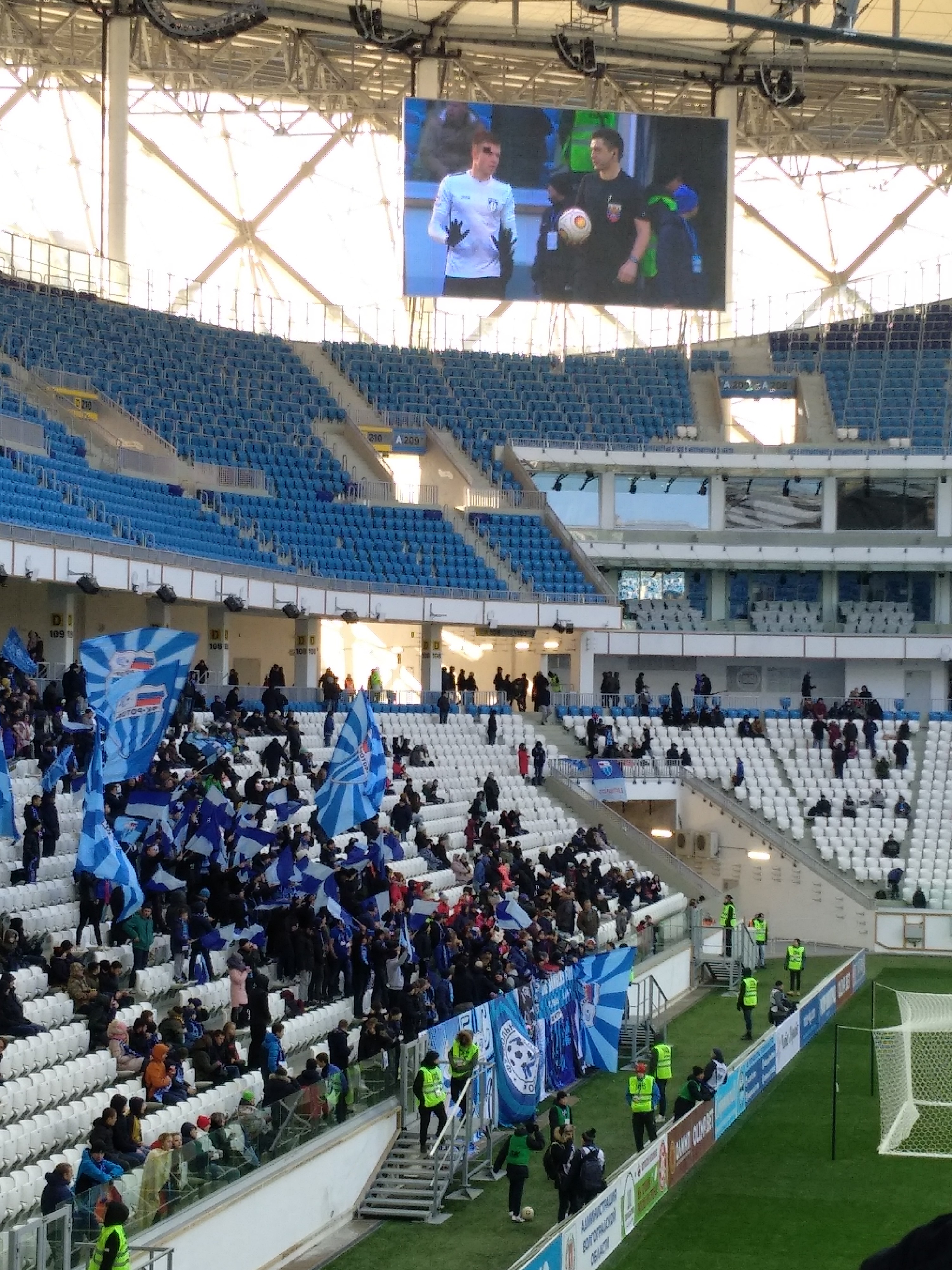 Нельзя судить по фотографии послематчевой. На фотографии стоят фанаты. Это сектор D . Сектор D был полный. Сектор С был полный. Сектор А был полный. Только сектор В был полупустым. В этот раз не могу сказать было визуально 10 000 тысяч или нет. Но нижний ярус стадиона был занят хорошо. На верхний ярус билеты не продавали. Только на секторе В на верхнем ярусе были фанаты Шинника.