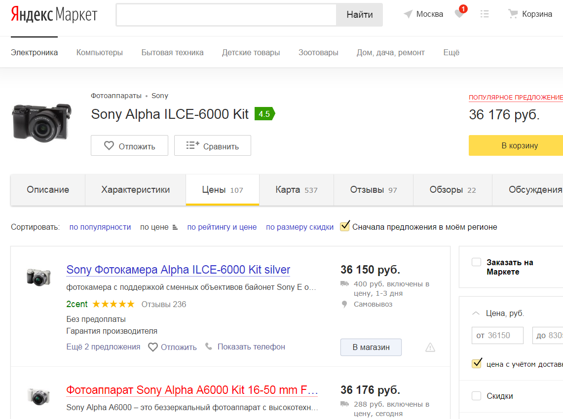 У вас на скрине регион Москва, про доставку и условия б/н расчёта в плеере и прочих аналогичных "дискаунтерах" я писал выше. Если вы живете в Москве, без проблем: оформляйте заказ, забирайте самовывозом и радуйтесь новому фотику за 36 тысяч. В ином случае попробуйте оформить заказ в Волгоград и посмотрите сами на итоговую сумму. ---------- Сообщение добавлено 23.07.2017 14:09 ---------- Тогда, исходя из вашей логики, сколько стоил весной этого года в магазинах NEX-6 Kit? Там, где реально продавался, а не убрать забыли. ---------- Сообщение добавлено 23.07.2017 14:10 ---------- Не с финансовыми затруднениями, а потому что "срочно понадобились деньги", разницу видите? Срочность подразумевает торг, но в разумных пределах.