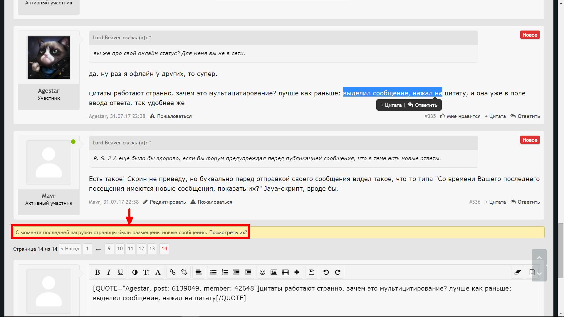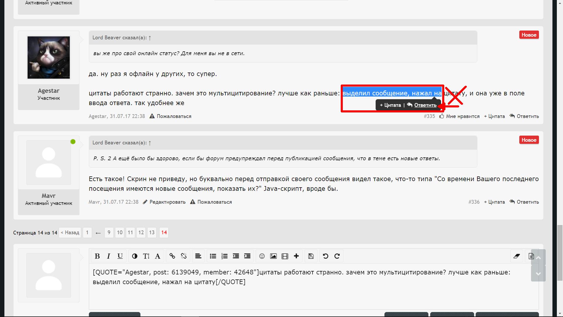 да. ну раз я офлайн у других, то супер. цитаты работают странно. зачем это мультицитирование? лучше как раньше: выделил сообщение, нажал на цитату, и она уже в поле ввода ответа. так удобнее же
