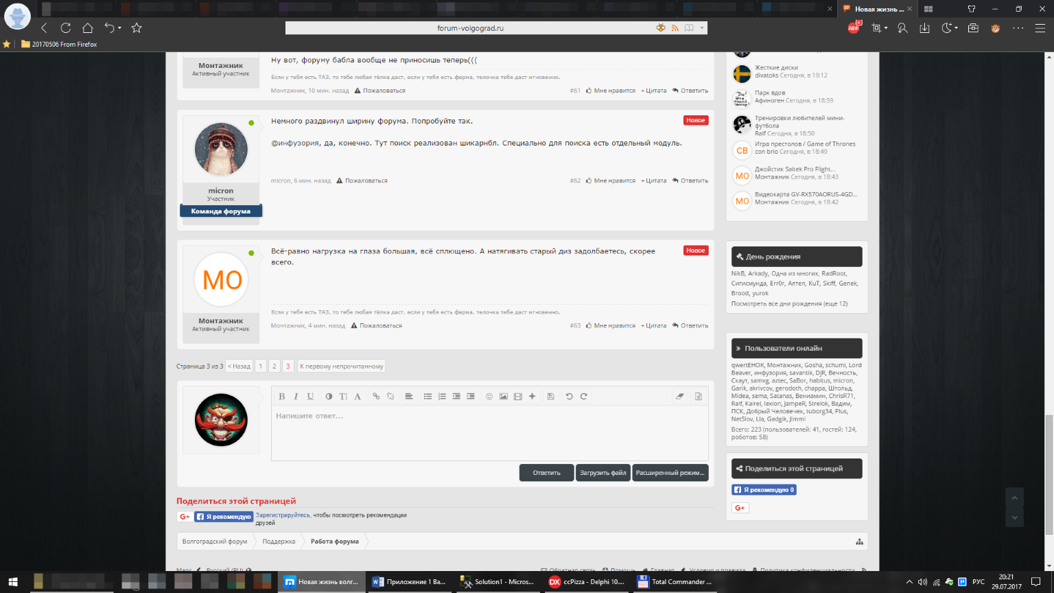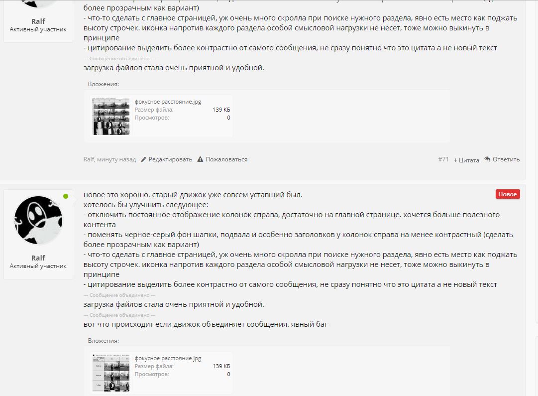 новое это хорошо. старый движок уже совсем уставший был. хотелось бы улучшить следующее: - отключить постоянное отображение колонок справа, достаточно на главной странице. хочется больше полезного контента - поменять черное-серый фон шапки, подвала и особенно заголовков у колонок справа на менее контрастный (сделать более прозрачным как вариант) - что-то сделать с главное страницей, уж очень много скролла при поиске нужного раздела, явно есть место как поджать высоту строчек. иконка напротив каждого раздела особой смысловой нагрузки не несет, тоже можно выкинуть в принципе - цитирование выделить более контрастно от самого сообщения, не сразу понятно что это цитата а не новый текст - отображение даты сообщения виде "среда 21:38" считаю неудачной. лучше использовать конкретную дату (26.07.2017 21:38) --- Сообщение объединено --- загрузка файлов стала очень приятной и удобной. --- Сообщение объединено --- вот что происходит если движок объединяет сообщения. явный баг