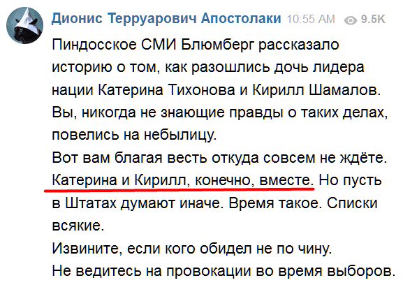 Интересные события происходят накануне новых индивидуальных санкций.Совпаление? Не думаю...И кого надурить хотят? В Сочи тоже думали что всех вокруг пробирки обвели.А теперь вся страна пожинает плоды .Тут тоже самое произойдет Блумберг сообщил о разводе Катерины Тихоновой, которую называют дочерью президента Путина, с Кириллом Шамаловым
