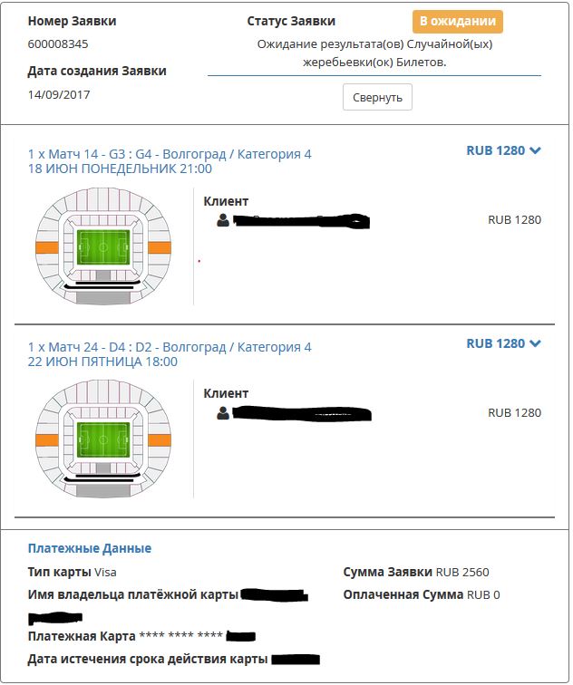 Приветствую всех любителей ЧМ. Оплачивал картой виза. Всё прошло успешно. Я так понял, что места узнаем, когда курьер доставит билеты? Удачи всем в приобретении билетов.