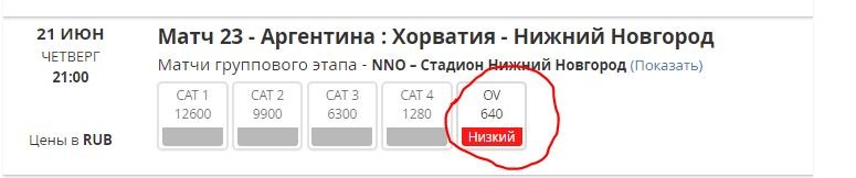 Вот интересно, билеты Нижний Новгород на 21/06 Аргентина-Хорватия - за 640 руб.))) Висят в продаже с 18 числа, почему-то до сих пор не выкуплены