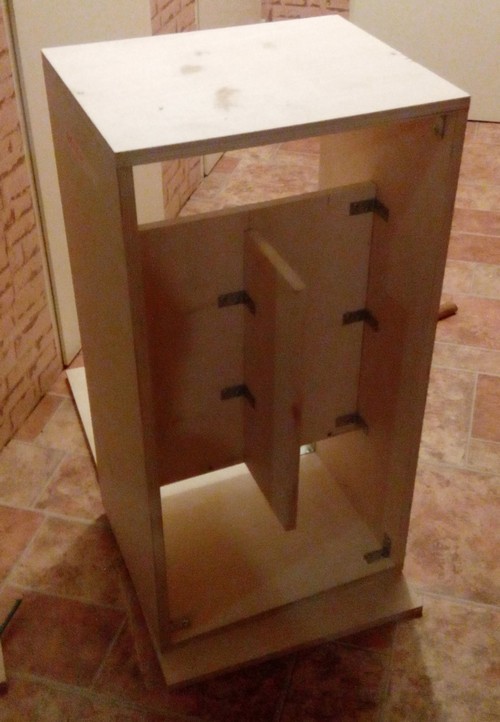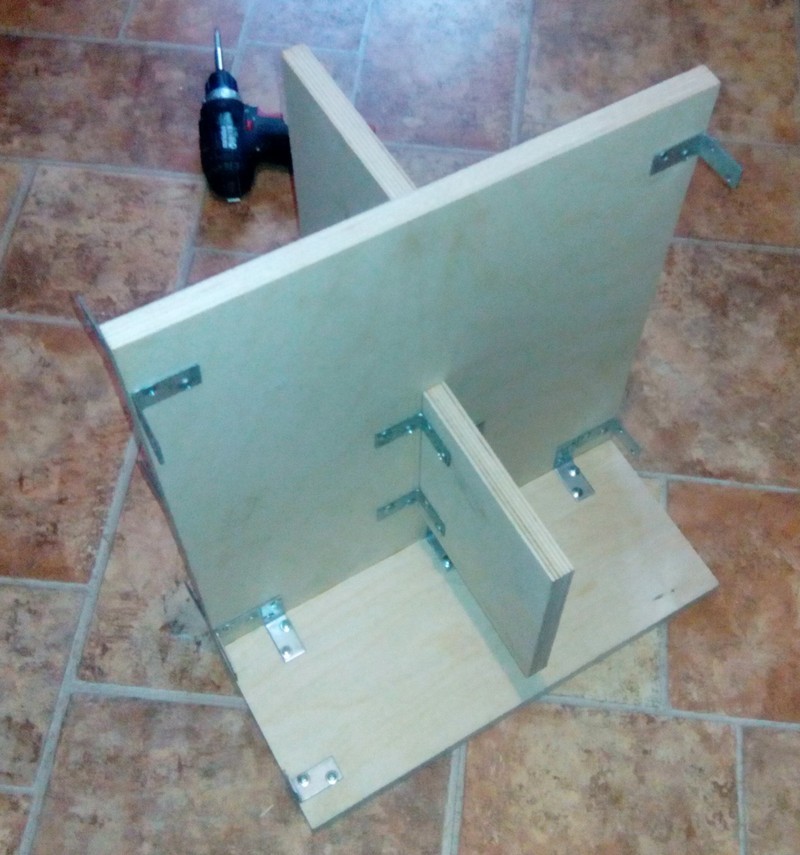 Ну что, взял отгул, начал сборку. Начал с центральной части (распорки), опыта постройки таких конструкций, которые сложнее чем просто ящик, у меня нет (в журналах Радио от не помню ничего такого, а другого источника информации у меня в детстве не было), буду познавать шишки сборки методом тыка. Сочленяю элементы конструкции металлическими уголками на саморезы , стык и уголки промазываются столярным клеем "Момент", а затем плоскость прижимается к торцу длинными саморезами. Судя по всему, скворечник получается забавный, птиц там сможет жить сразу несколько семей (если мелких). Да, размышления на тему "где купить акустические терминалы" завели меня к решению - "а нафиг они нужны?" - место установки колонок известно, ну и зачем нужны все эти сочленения? брать сразу хороший провод, и от динамика до выхода усилителя и использовать.