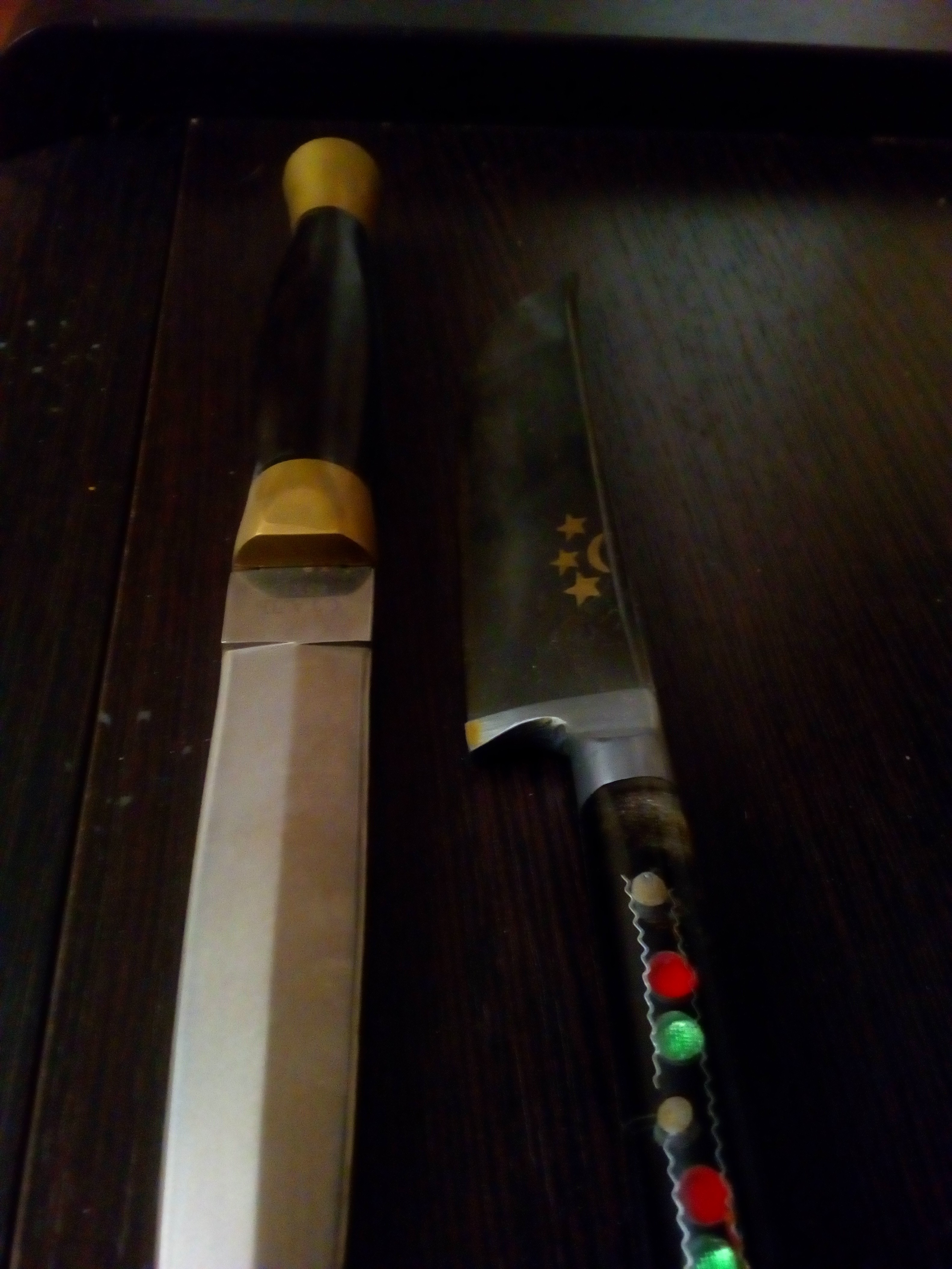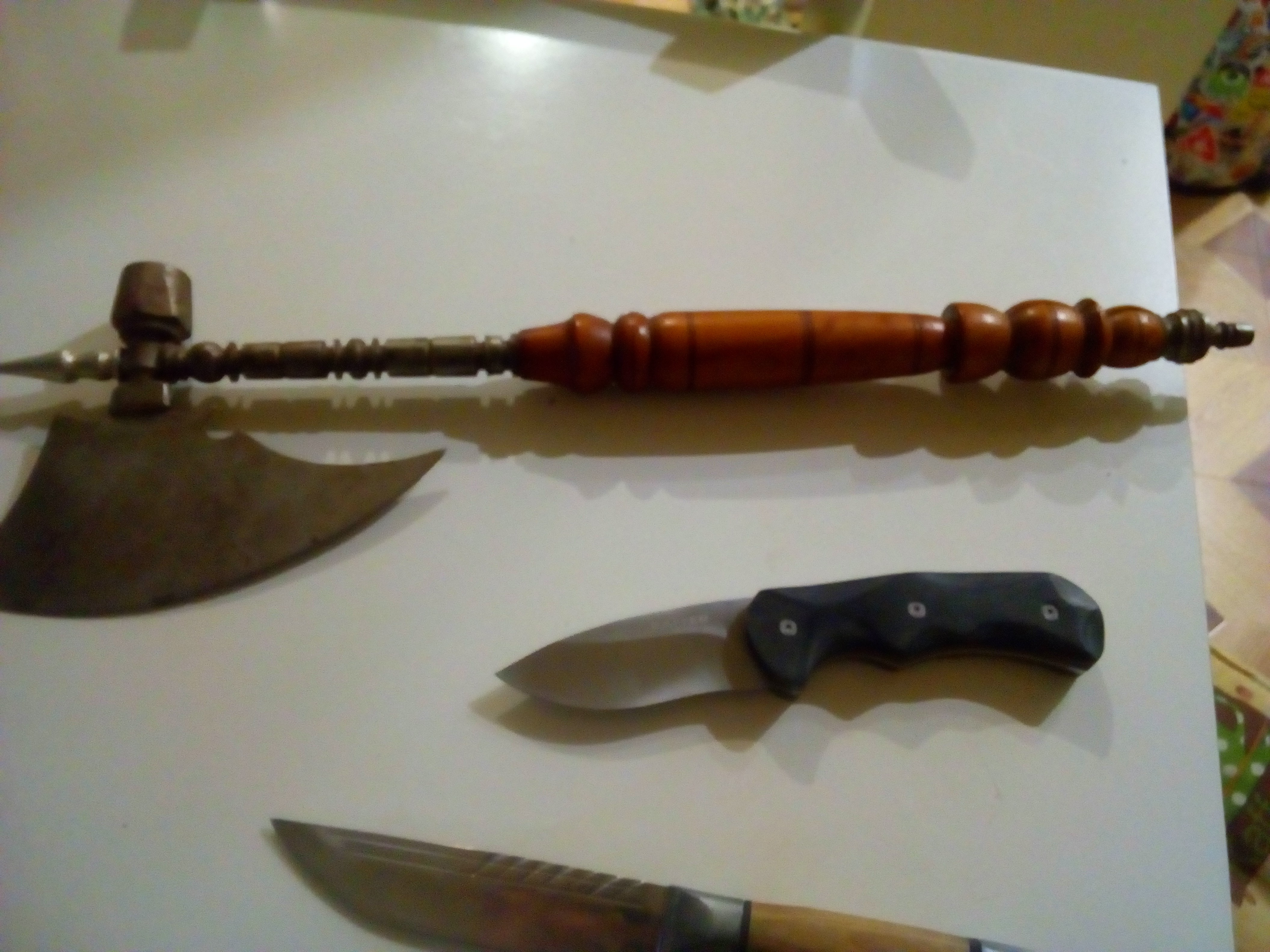 Продам: 1. Топорик для рубки мяса. Времен СССР, дефект - трещина в деревянной рукояти, рукоть под замену. 500 р. 2. Нож Витязь, железо - 65х13, дефект - лопина на лезвии, на фото видно, требует переточки. 300 р. 3. Нож Раффер, без дефектов., куплен на сдачу в хищнике. 300 р. 4. Нож Витязь, "кинжал", 65х13, вот такой - Кинжал Витязь B110-33 купить в магазине ножей КЛЫК.РУ. Ножи Витязь (Россия) 500р. 5. Нож Пчак, узбекский, ШХ-15, рукоять оргстекло, ручная работа. 500р. Отдам только все вместе. Все - не ХО. +500 рублей и подберу ко всему кроме топора скромные ножны.