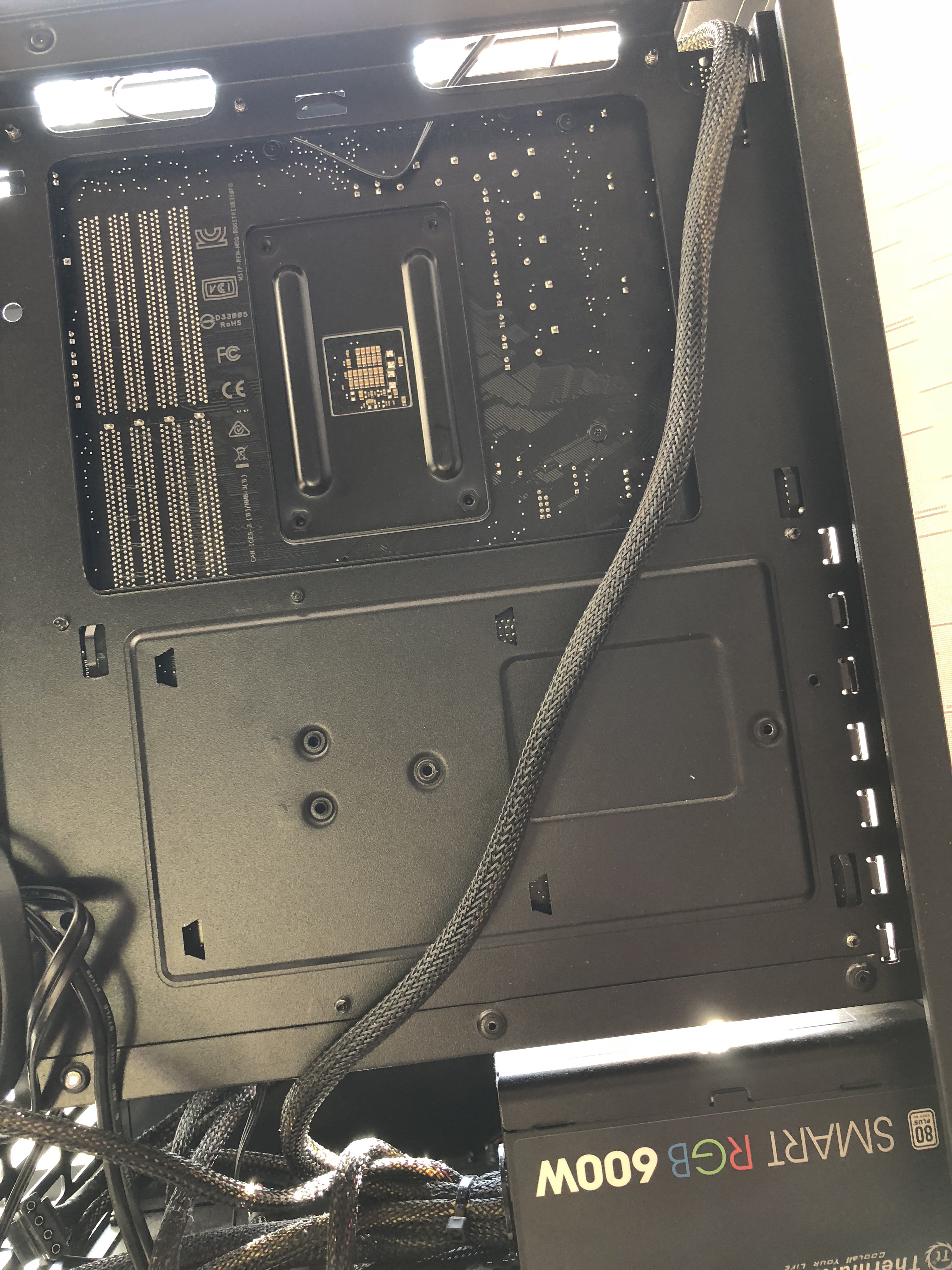 Вы бы это... Блок питания то все же поставили б правильно, зачем вам дополнительный горячий воздух внутрях корпуса??? Подсветка это, конечно, хорошо, но не при таком расположении БП ))))