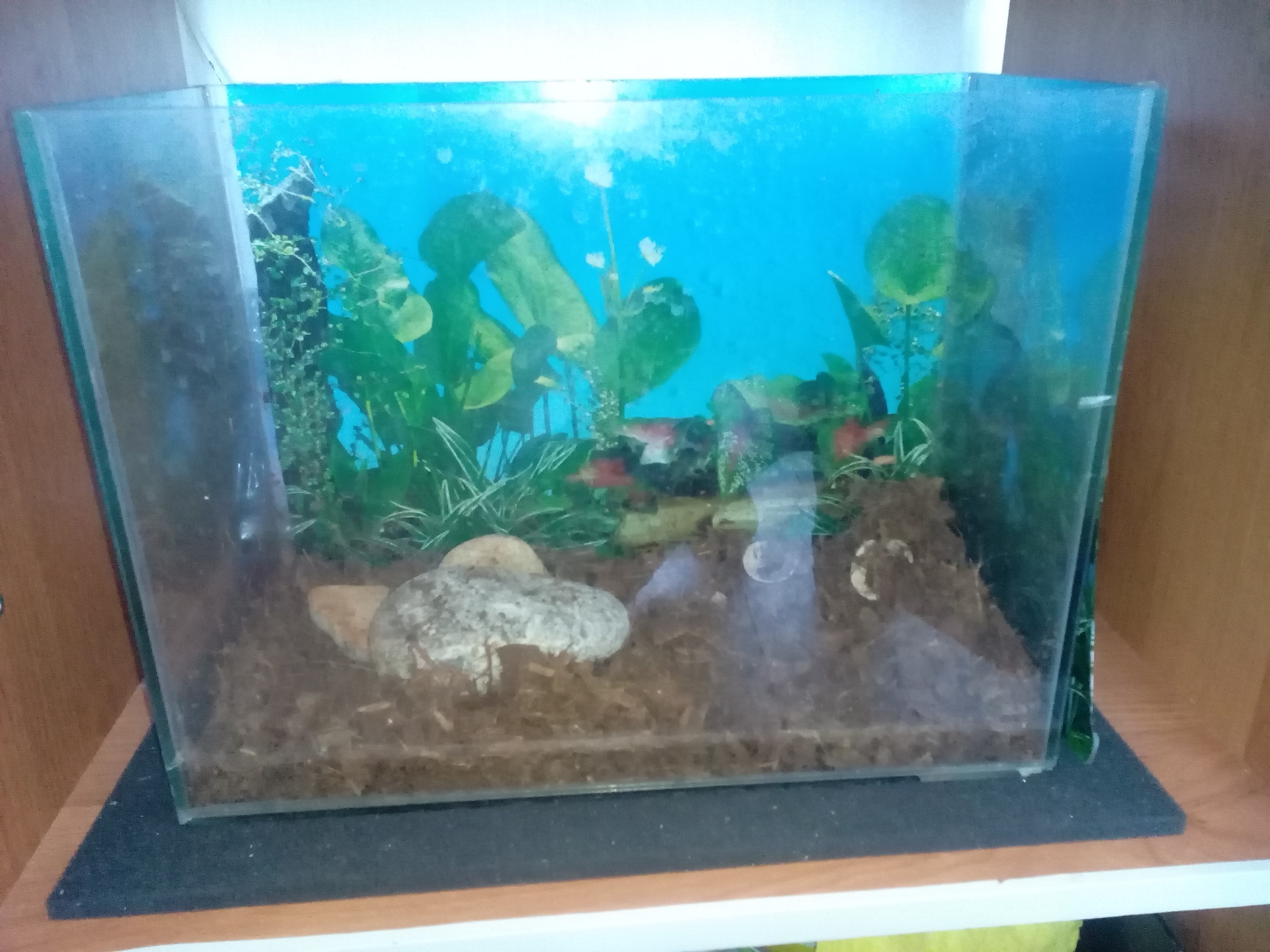 Аквариум около 30л с кокосовой стружкой. В нем жила улитка Ахатина. Для рыб не подойдет, т.к. есть трещинка на дне. Забирать на красном. 39-я гвардейская. Яблоки/апельсины/сок приветсвуются!