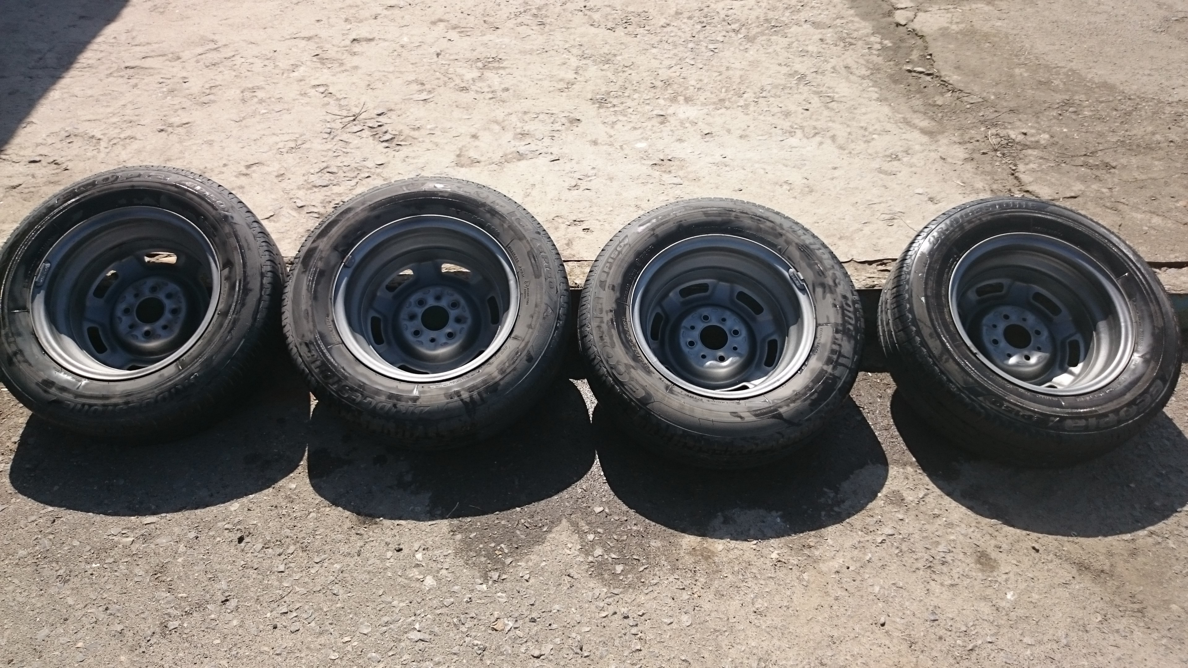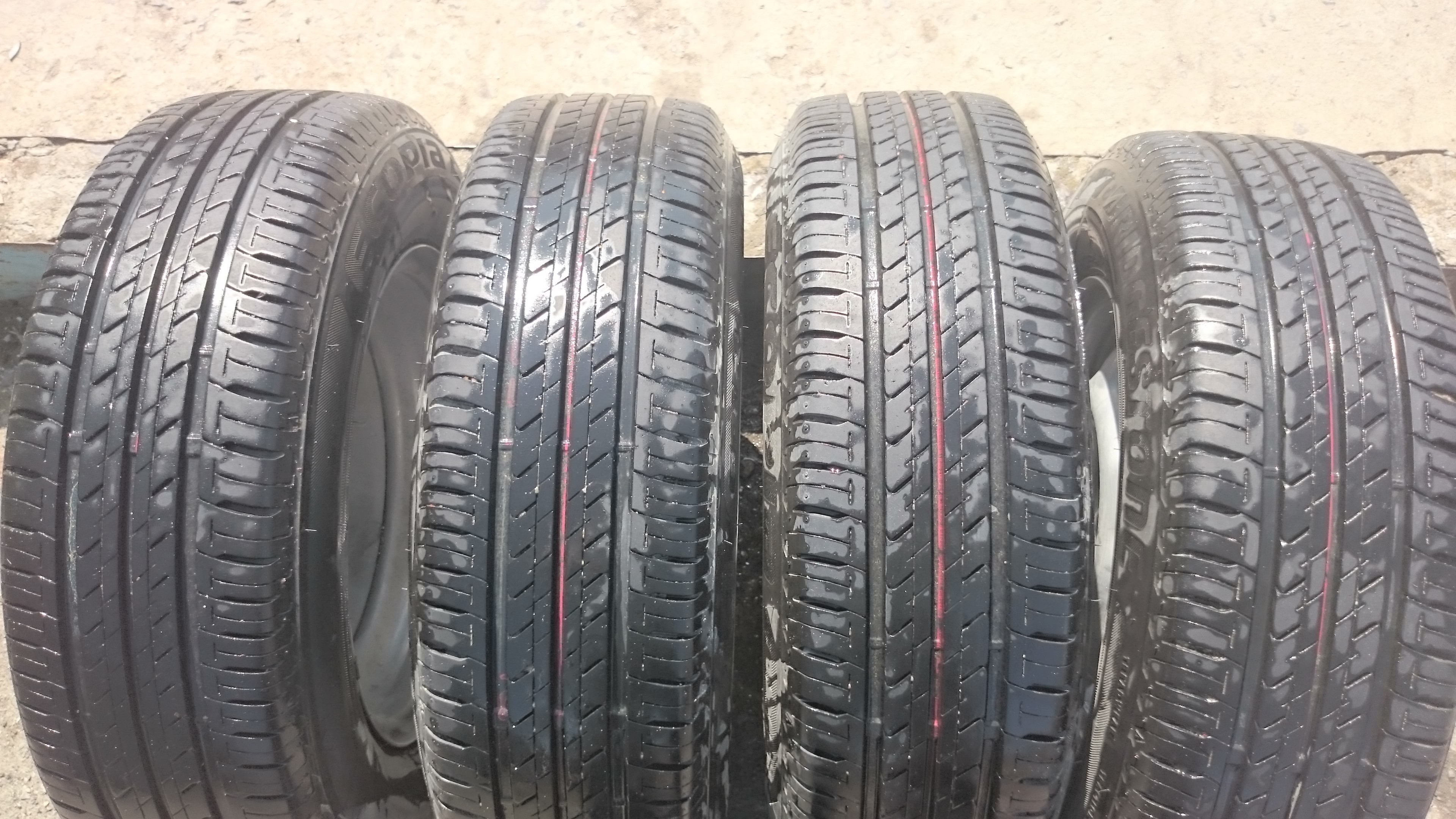 Продаю летний комплект, Ecopia ep150 Bridgestone (с пониженным коэффициентом сопротивления качению). Комплект куплен в прошлом году. Я на ней и сезона не отъездил, если на ней 3 тыс. км проехал - то наверное это с натяжкой максимум. При чем по хорошему асфальту (в городе у нас был еще такой)). За зиму не подспустил ни один баллон. Не стал специально ни силиконить, ни чернить. Помыл в гараже, сфоткал как есть, скрывать реально нечего. Без порезов, без проколов, без шишек. Реально новая резина. Кстати, на нее вроде еще даже гарантия не закончилась. Цена за комплект видится в районе 9-10 тыс.