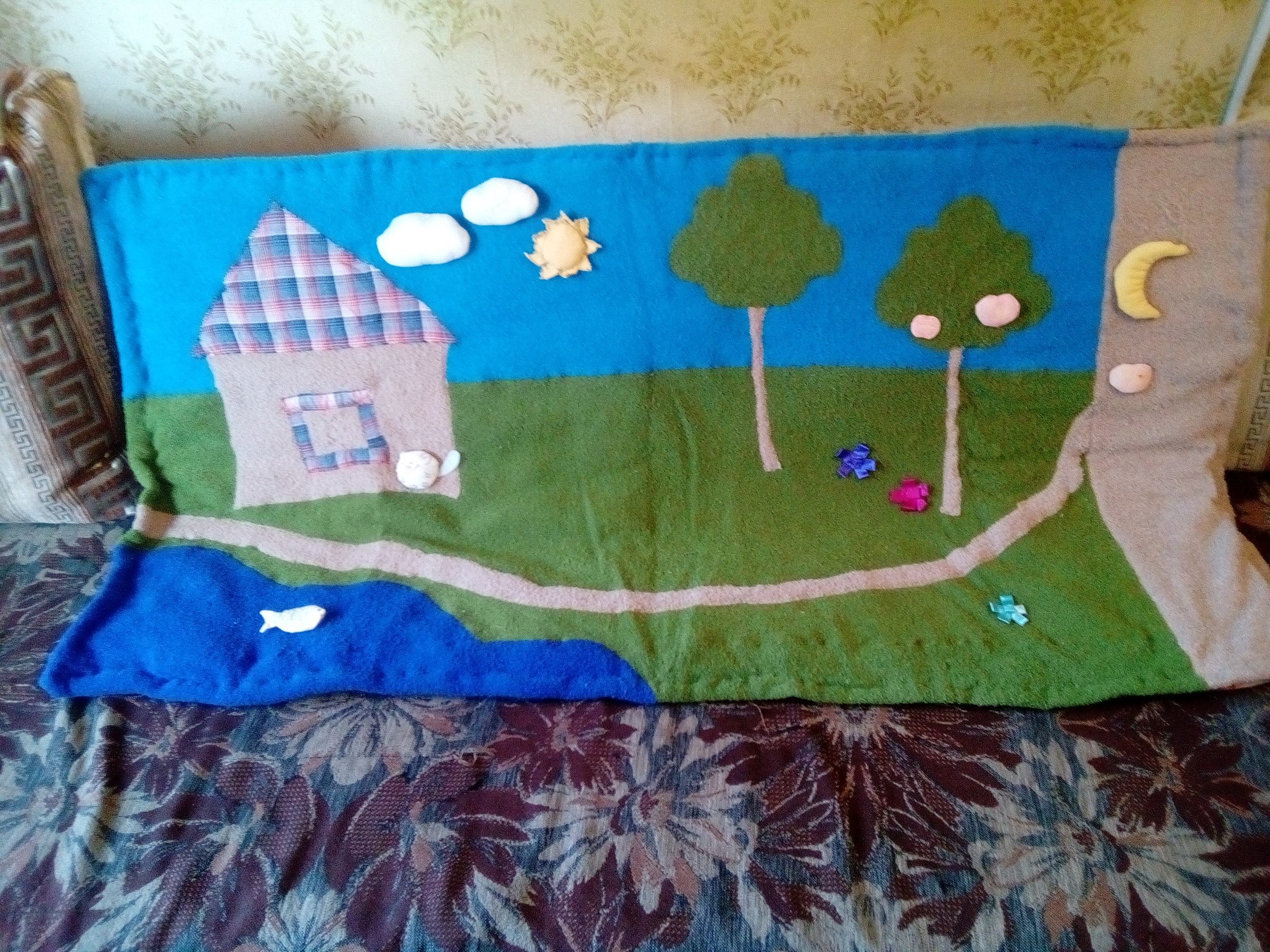 Собственно, развивает он или нет - мы не в курсе, но мой младший его очень любил. Коврик из ворсистой ткани, вешается на стену, на него на липучках крепятся фигурки Солнца, Луны, облачков, и пр. Если вдруг модератор зачем-то опять переместит тему: отдам даром.
