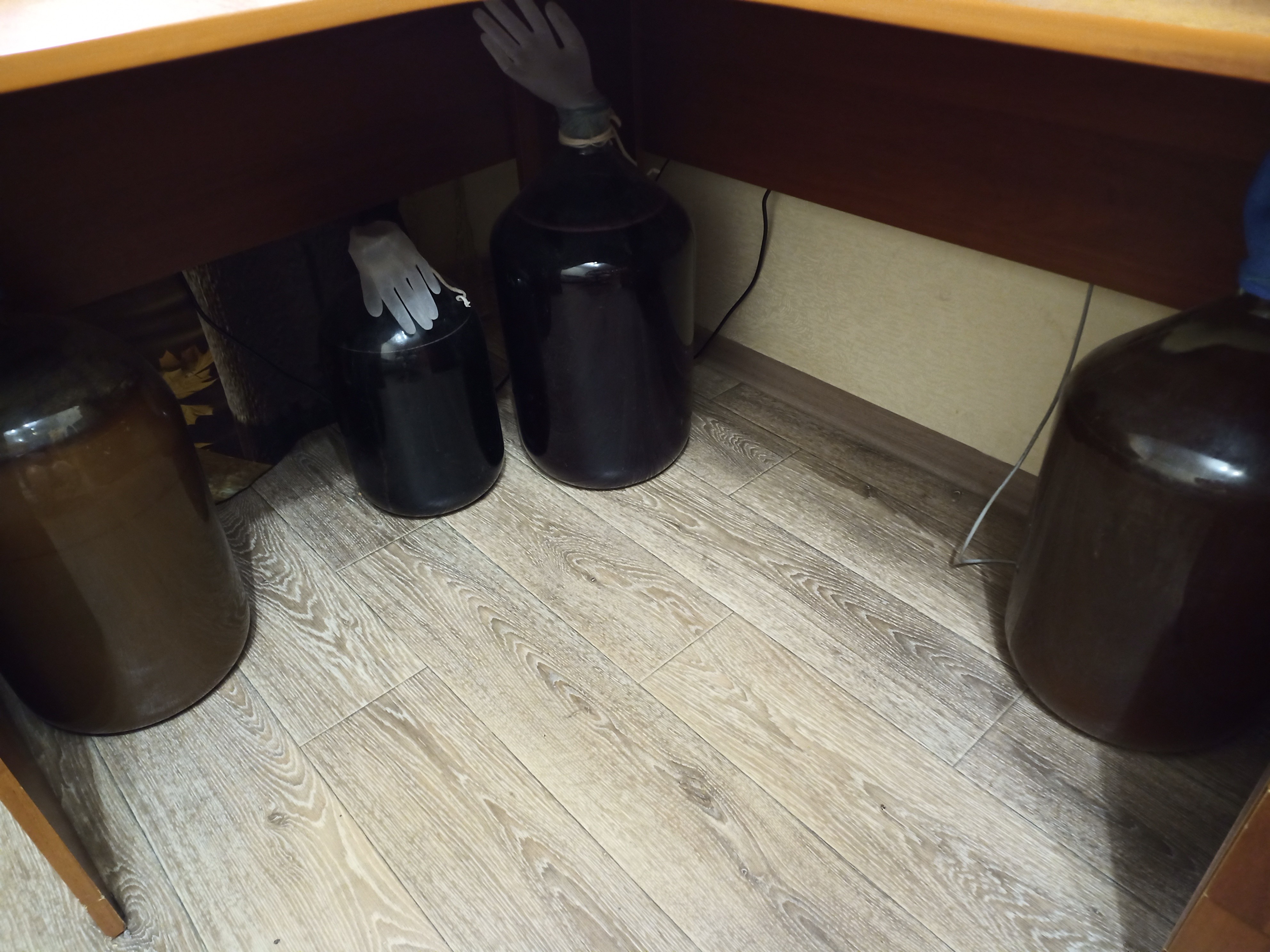 Да все как обычно. Перчатка как сдулась, подсыплю сахара. Она опять надувается. В некоторых бутылях вино уже прозрачное месяц как, а все равно бродит.