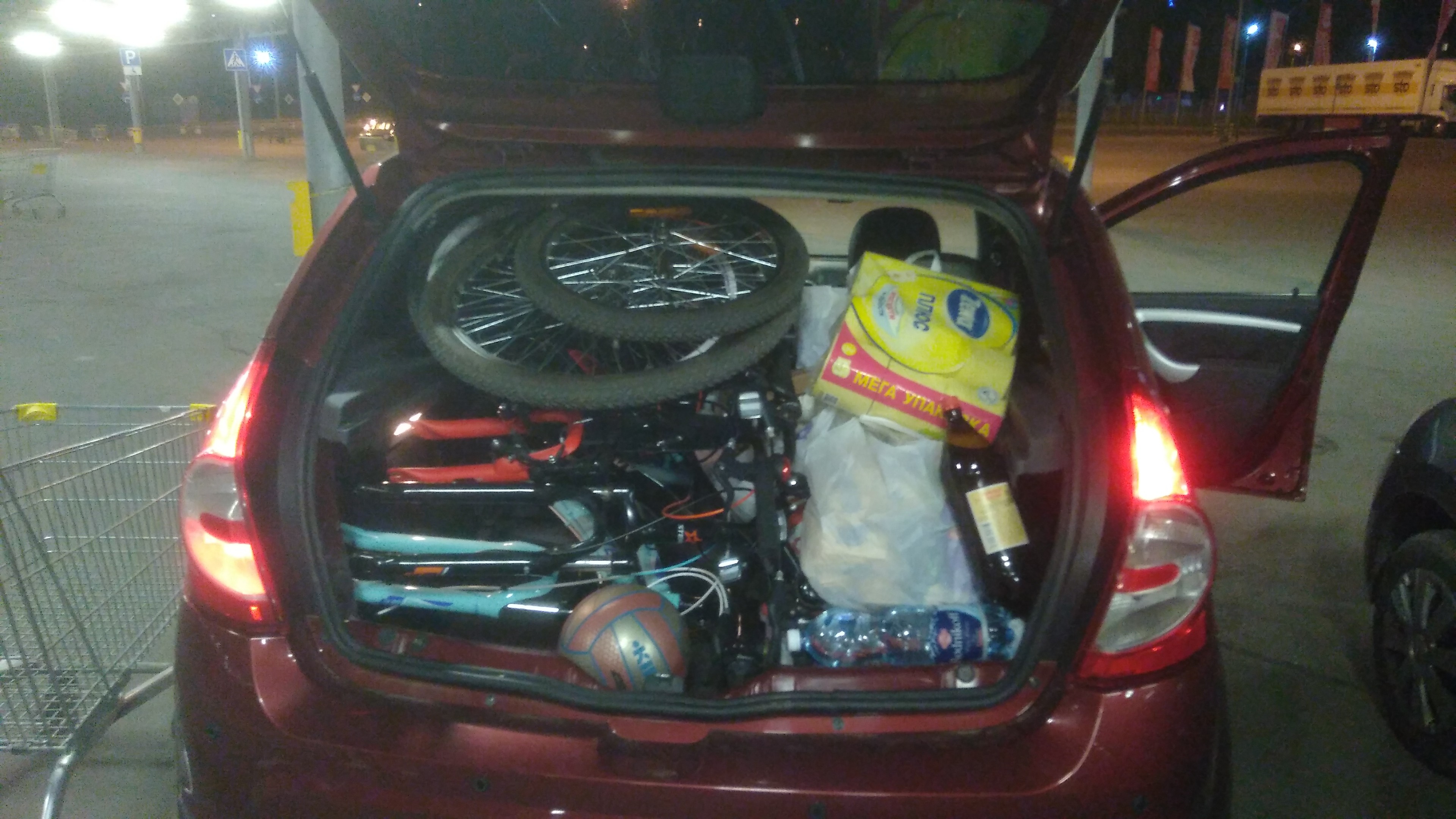 два велосипеда 26", один 20". справа лежит ящик с вещами(практически вровень с кромкой багажника), сверху несколько пакетов из магазина.