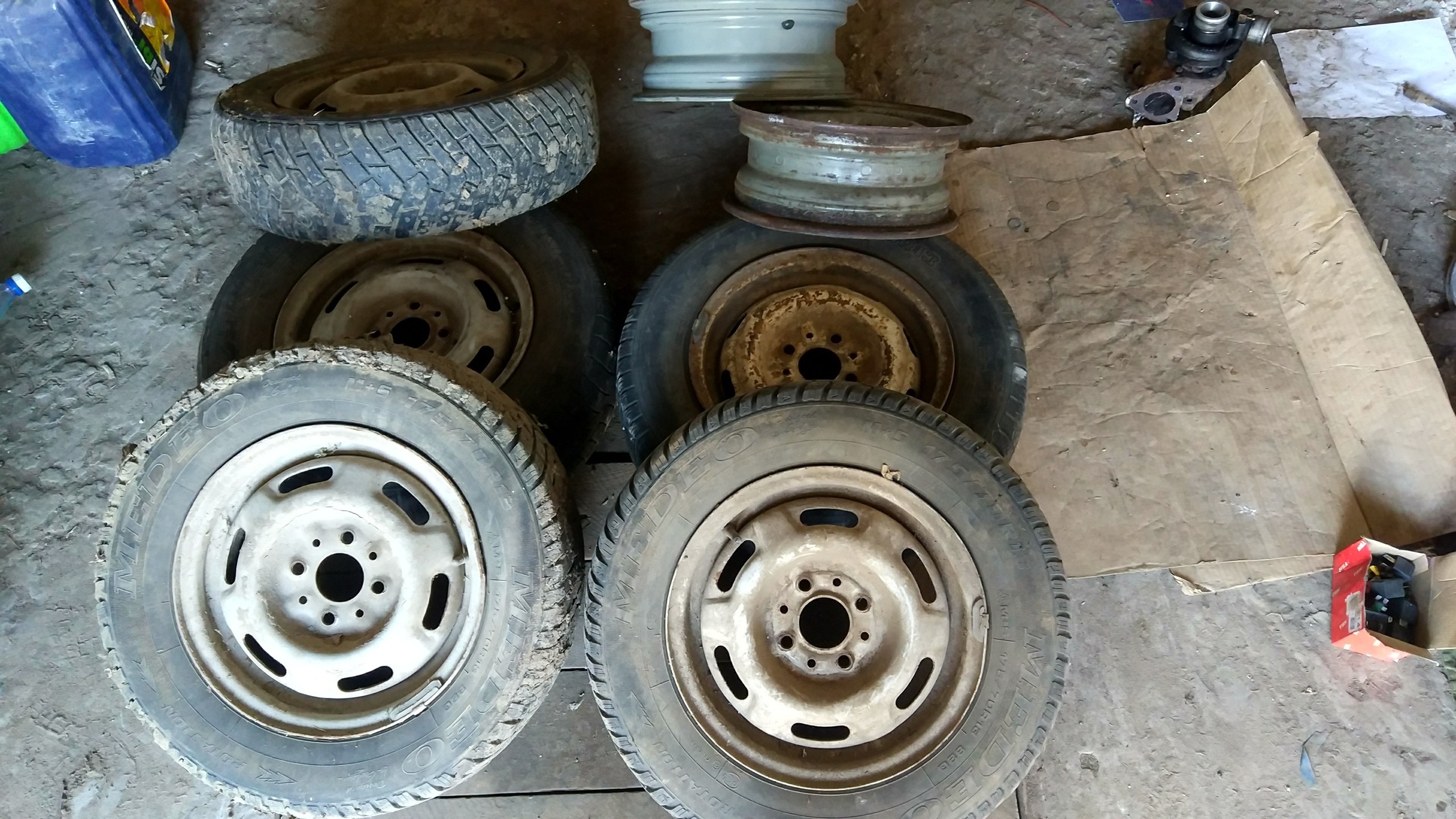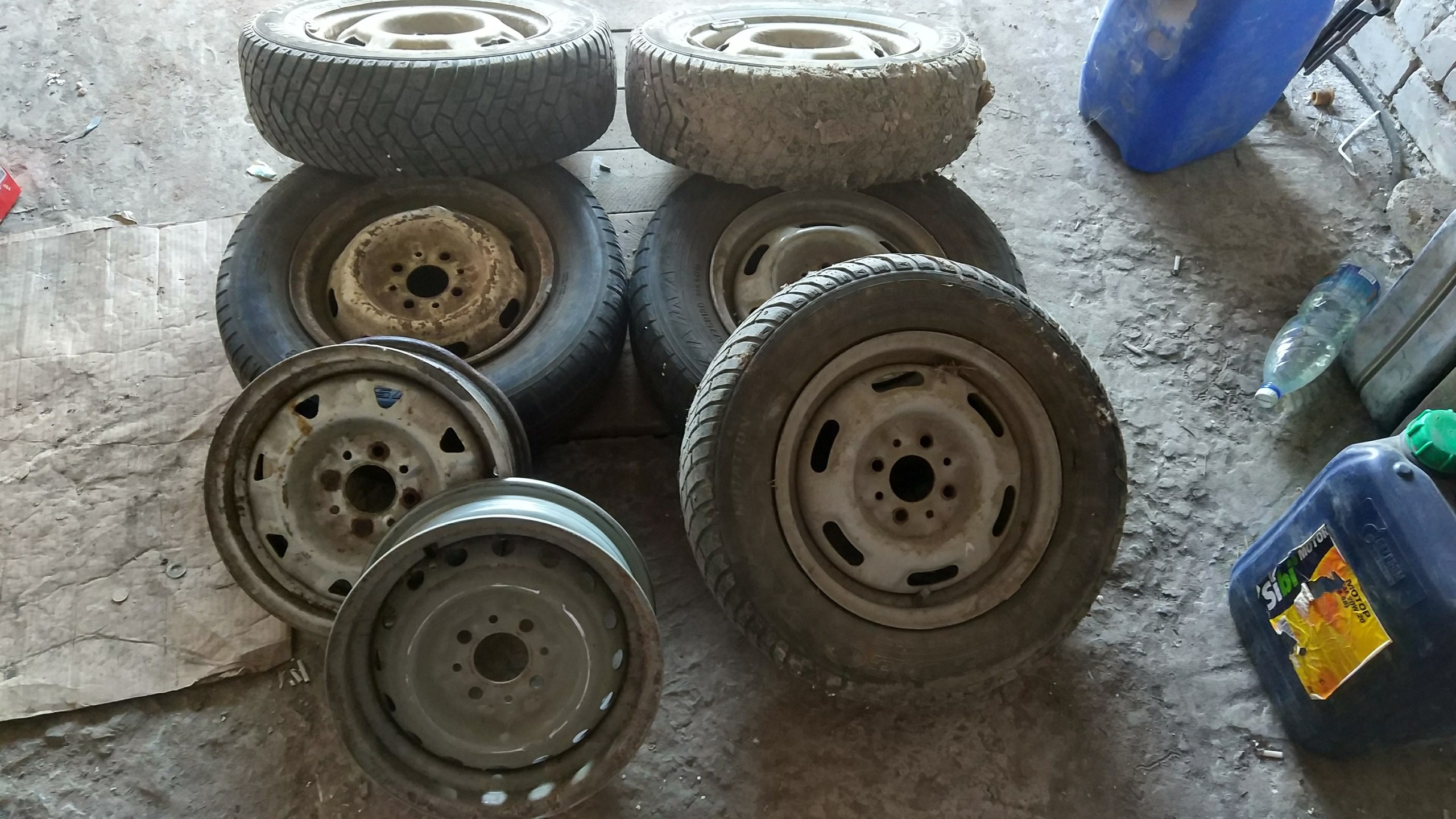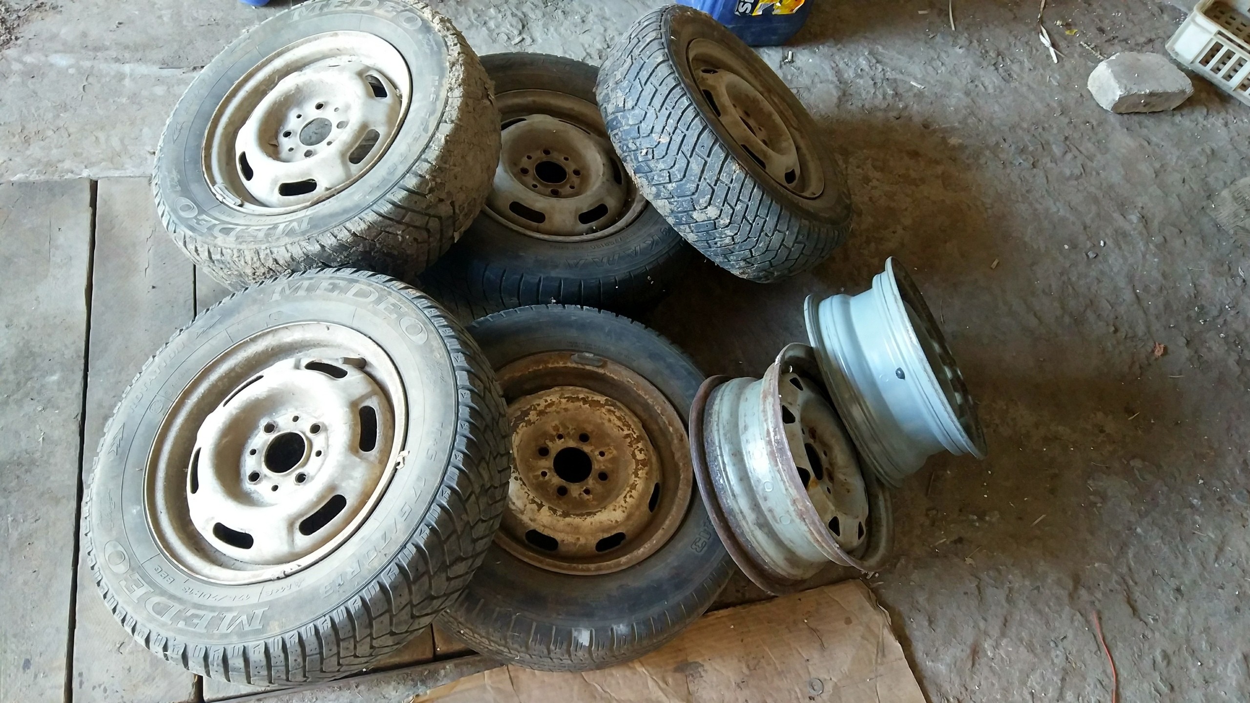 Продам колёса в сборе (5 штук) и два диска. 13 радиус. Стояли, кажется, на ВАЗе «Пирожке». Резина вразнобой, состояние оценить не могу. Все диски кроме одного внешне в норме. Смотреть на 7ветрах. Хочу за всё 2000 рублей.