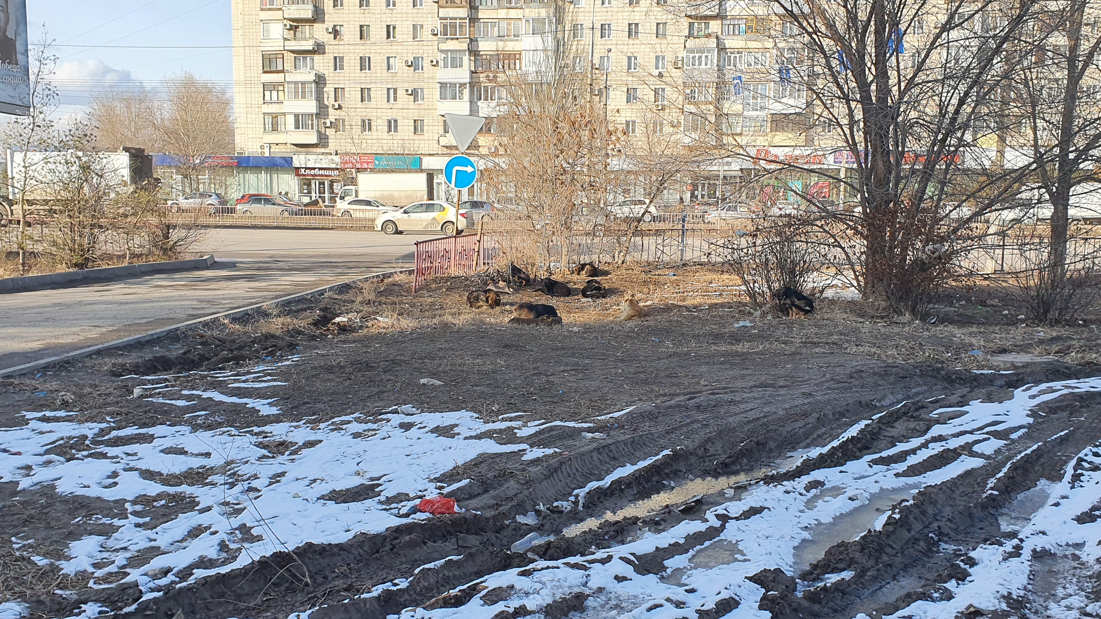 Весь Волгоград в одной фотографии: стая собак, пыль и грязь, отсутствие разметки на дороге. (Красноарм.)