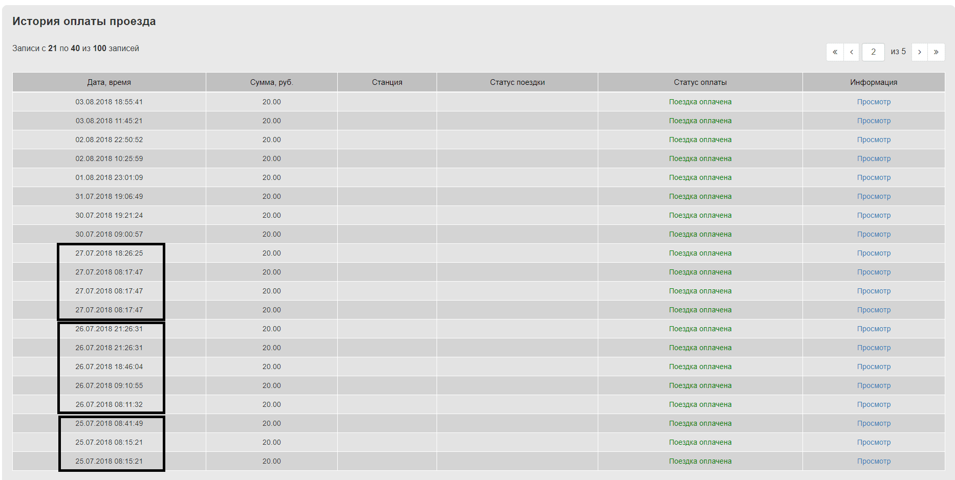 Да время пофиг. оно вообще мало на что влияет, может быть множество технических причин, почему терминал так проводит операции. Тут два вопроса (интересны на них ответы) 1) Сколько операций списания в банке (так как на картинках это же некоторый отчет из билетной фирмы). Главное же сколько в итоге в банк передали списаний. 2) Сколько реально было поездок (совпадает ли реальное количество поездок, с реальным списанием в банке). Так то может просто отчет на сайте билетном глючит. в на билетом сайте 5-ть строчек, а в банке всего одно списание.