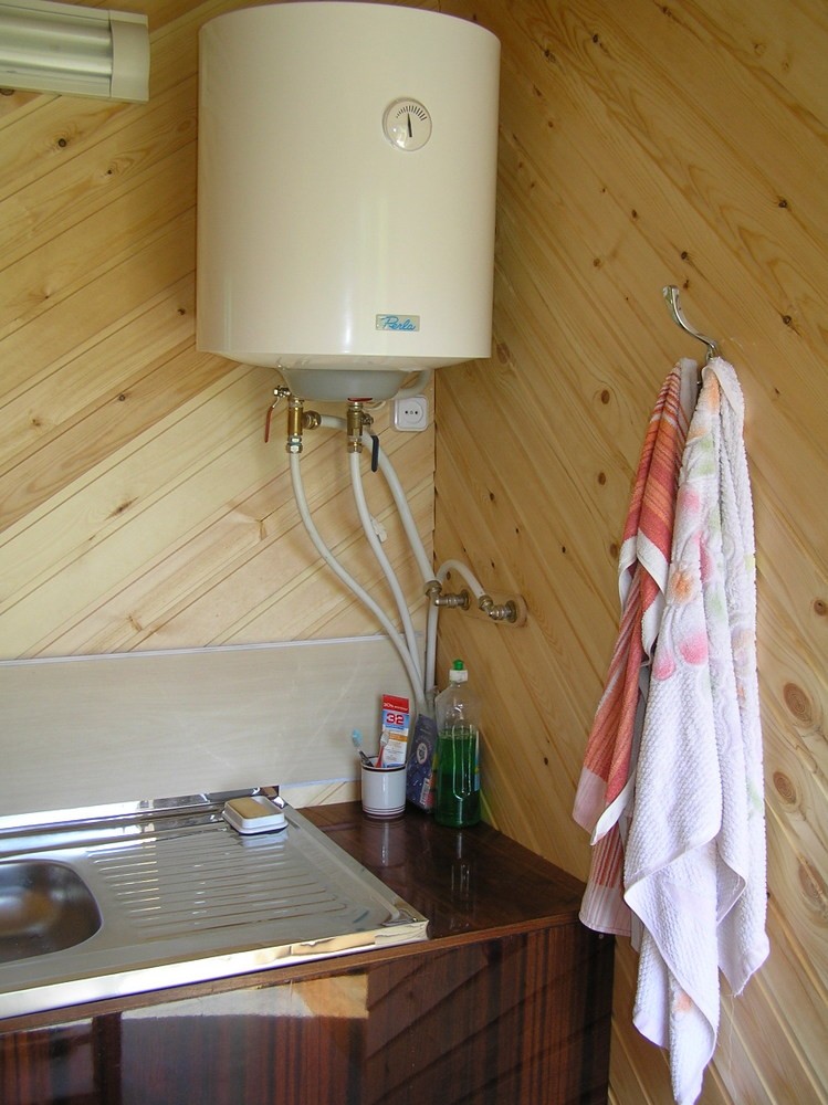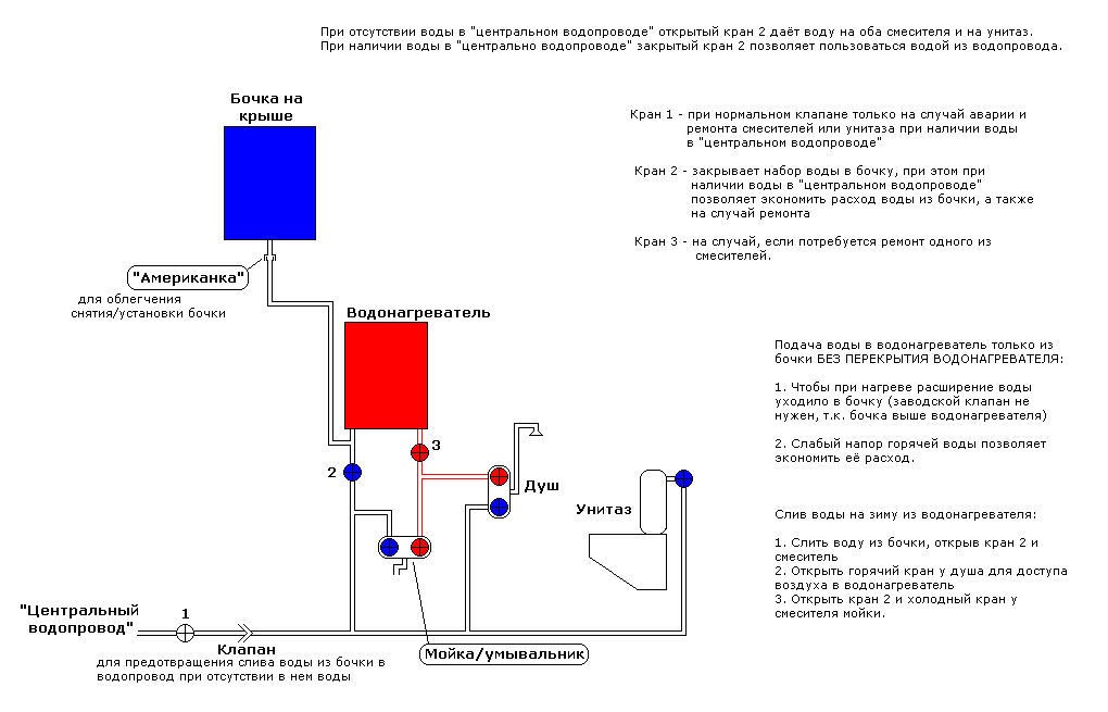 Сфоткаю в следущие выходные - покажу. У меня так и сделано. Если точнее, то сначала выдавливает воду, а потом воздух, т.к. горячая вода из бойлера "выходит" в верхней части бойлера. Схема моего водопровода в хоз. блоке: не так, - потом внутри бойлер, если им долго не пользоваться, заполняется паром Если бочку не утеплить, то в холодное время тэн будет греть воду, а та будет греть воздух вокруг бочки, моментально охлаждаясь, - толку от этого тэна будет почти 0, и будет он работать круглосуточно - законы физики не обманешь (и это тоже было проверено .... соседом на практике, он никак не мог понять, почему за весь день вода в бочке так и не нагрелась). Ну а ставить тэн на 3-4 кВт - это надо хорошую электропроводку от самого счетчика иметь, иначе можно будет греться потом от огня, правда, не долго. Т.е. это опасно только для бойлера? А для людей? Смотрю на соседей, и кажется мне, что я один такой идиот, который заботится о чистой воде в бочке, из которой всё лето, а также часть весны, и до ноября осенью мы моемся и моем посуду. Вода не только расширяется, но и при определенном изменении температуры сужается в объеме. Сифон излишне. "Греметика" - зло: как потом мыть бочку? Оно всё равно будет потихоньку покрываться илом, просто при использовании хлора или перекиси, это будет идти медленнее. Достаточно просто крышки и маленьких отверстий в верхней части бочки для нормализации давления.