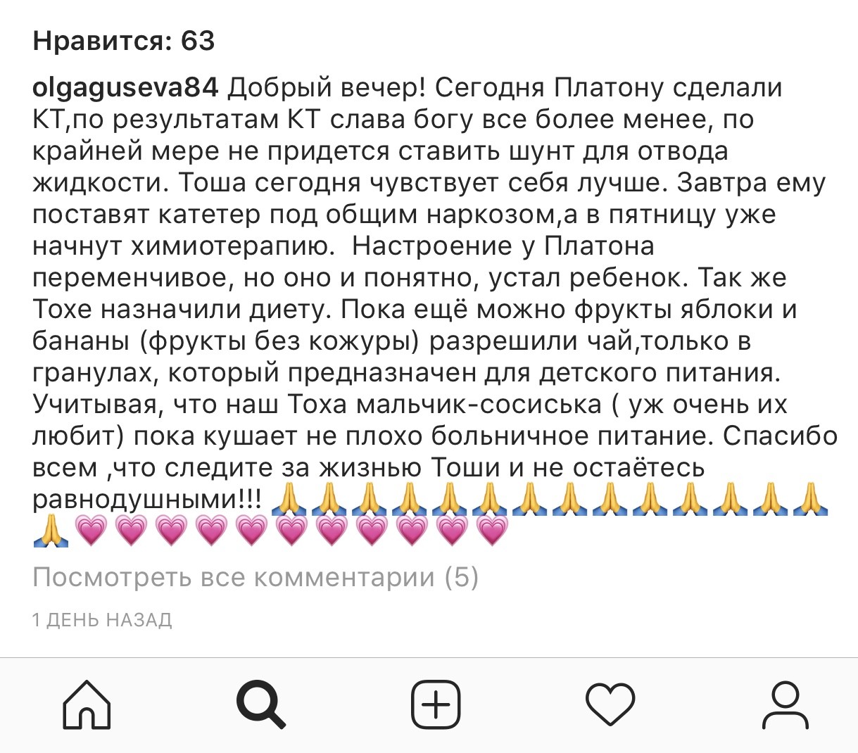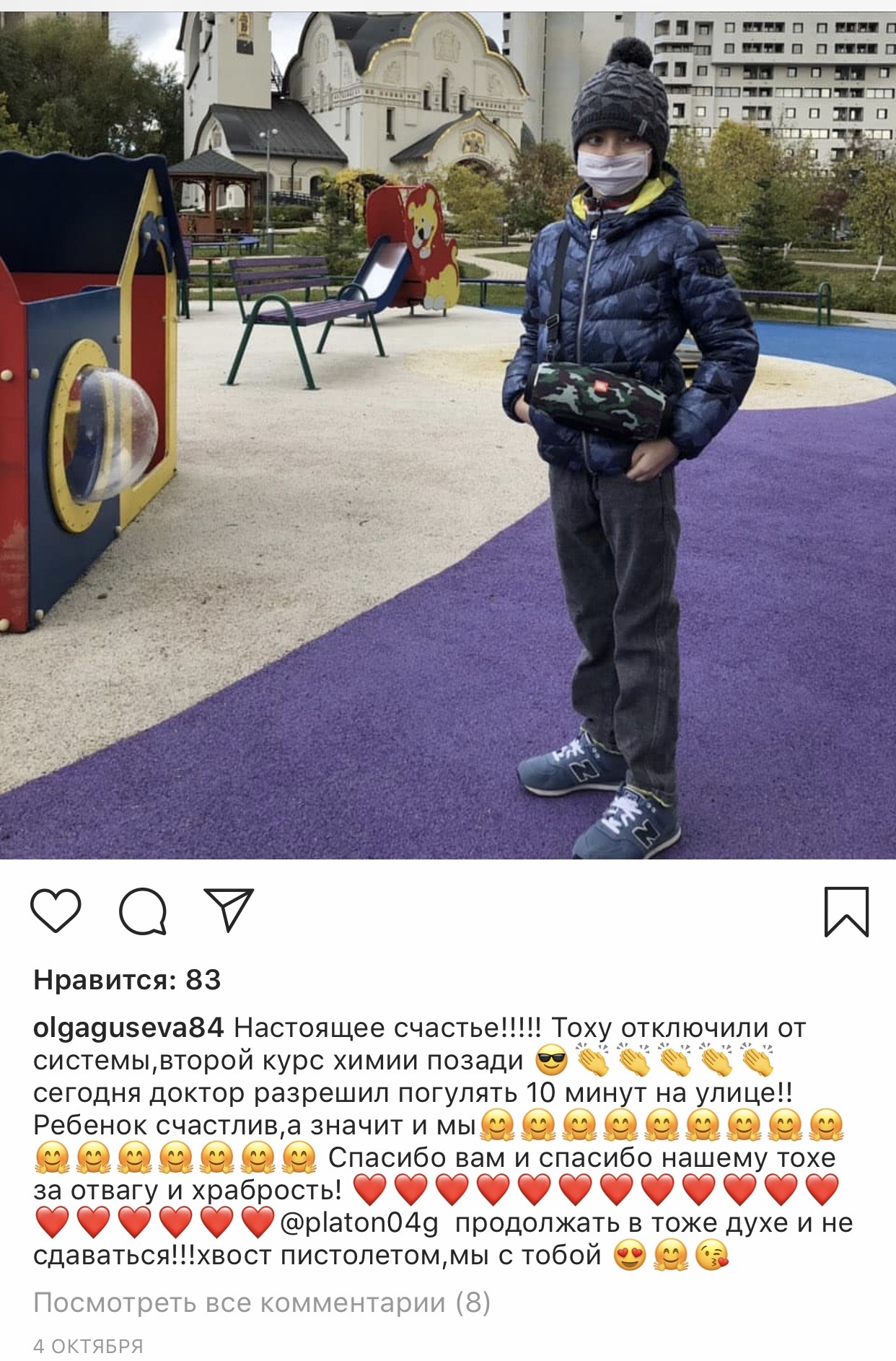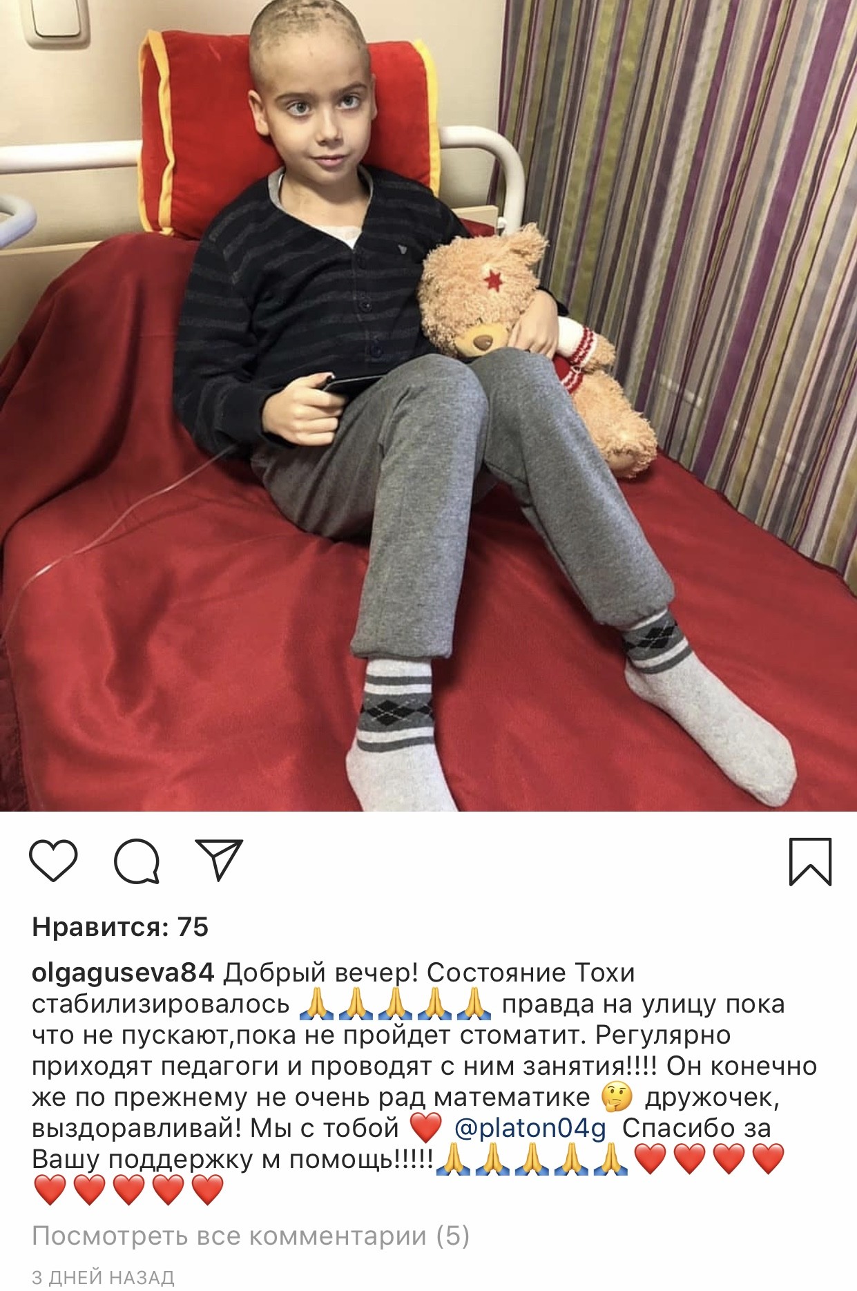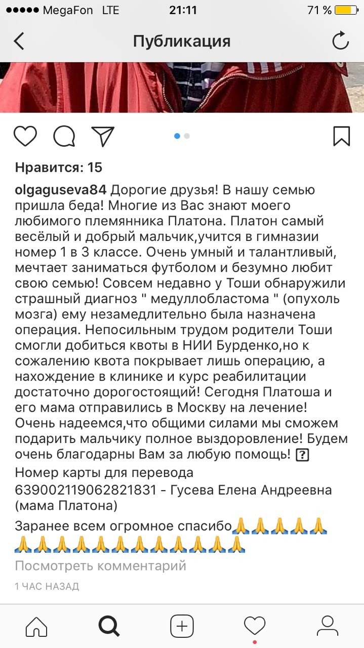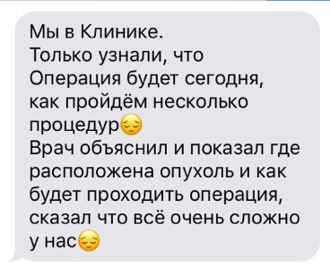 крайнее сообщение Завтра у Платоши будет операция и под общим наркозом ему будут устанавливать в голове резервуар Оммайя. Он ставится на всю жизнь Врач назначила сначала нам химию, ударную дозу !!! После того как её пройдут, будет трёх недельный перерыв за который будет сделано повторное МРТ и все анализы. Если после первого курса результаты и анализы будут хорошими, то после химии будут проводить лучевую терапию ! Если после первого курса, химия не убьёт остатки опухоли и метастазы, то будет повторный такой же курс, а после чего облучение. В следующий понедельник нас ждут на госпитализацию! Лечение будет проходить:«ХИМИЯ» НПЦ ВОЙНО-ЯСЕНЕЦКОГО «ЛУЧЕВАЯ» ФГБУ "РНЦРР" Минздрава России КУРС ЛЕЧЕНИЯ: 4 дня химии,14 дней отдыхаем (и так 4 раза), затем 21 день перерыв. После химии и отдыха будет облучение 40-60 дней, которое мы будем находится всегда в больнице. Находиться нам надо будет всё это время в Москве и соответственно пока будет идти химия будем снимать квартиру рядом с клиникой. Примерная стоимость квартиры 35-50т в месяц без коммунальных услуг, предоплата за первый и последний месяц сразу ! Для нас исключены на всё время лечения любые контакты, никаких прогулок вообще. Получается примерно при лучшем раскладе и хороших анализах и МРТ в Москве мы будем жить до конца декабря.
