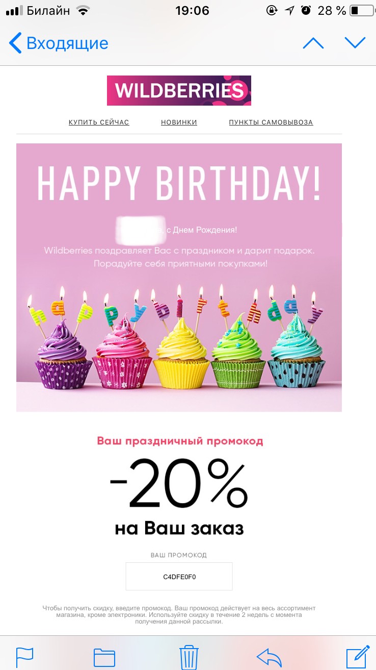 Давно у них заказываю, но скидки именно на Др и именно на все мне не разу не давали... это точно? Не, периодически шлют скидку 20-21, но это замануха, потому что по факту она оказывается ну совсем не на все. Совет - мониторить цену каждый день, иногда и пару раз в день. Бывали случаи, цена падала с 1500 до 500 на пару часов))) к примеру. Не помню когда, может в октябре(?), будет "чёрная пятница", или как она там называется, раньше по ней была скидка на 15 на все. А так у них скидки хитрые - пишут "на все", а на самом деле... гигантский перечень исключений. Пс: Напишите модель, гляну свою цену. На Керри, к примеру, сейчас у меня 15+10% скидка. Я обычно беру, когда скидка 15+50%)))) ППС: на рейму у меня - 7%, на хуппу- 20, густи - 15+20.У них хитрая система)) но иногда очень выгодно