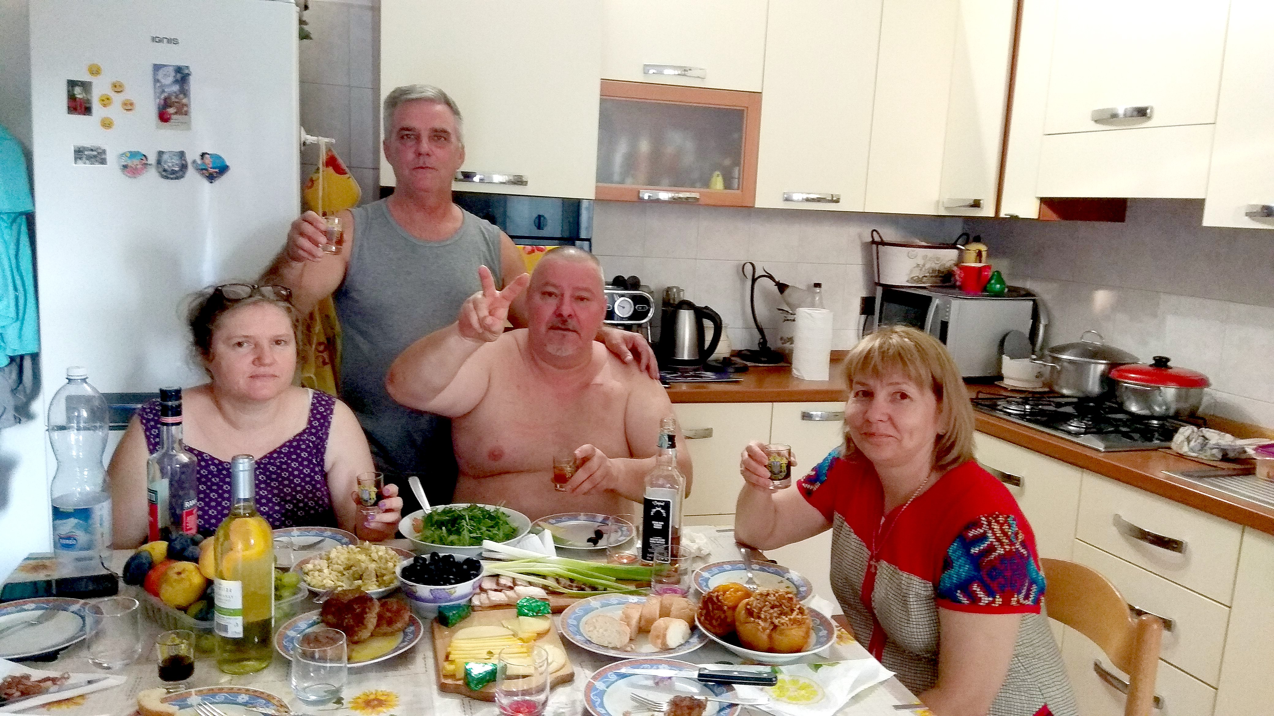 А... Серега позвонил. Стол накрыт -пора отметить встречу ! Сергей мой друг с 1981 года. Вместе учились в ДОСААФ в Черновцах на радиотелеграфистов. Потом вместе служили пол года в Смоленске в учебке. В общем дружба проверена временем . ! Жена русская. Соседи наоборот. Муж русский-жена украинка. ДА какая разница кто есть кто ! Быстрее за стол. Все супер - вот фото наших друзей. Ув. волгоградцы-не пугайтесь- это фото так получилось- Серега вообще добрый ! В общем- на-пи-ли-ся. Все-спать . На утро у нас уже билеты на Геную ! Родина Х.Колумба и город где часто бывал Н. Паганини ! Древнейший порт. В предвкушении завтрашнего дня - и раннего подъема -ложимся спать