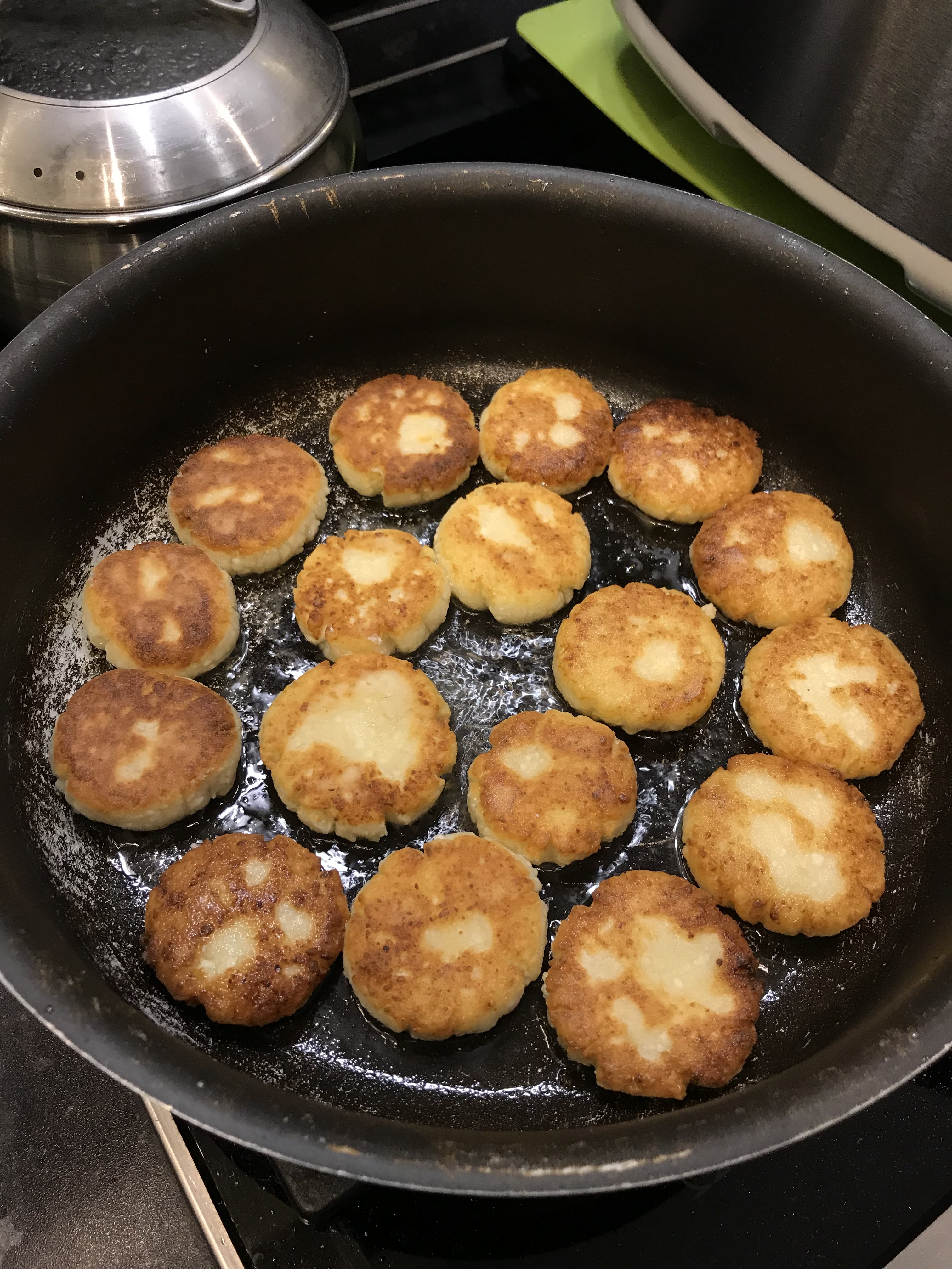 Чтоб жопа не слиплась, потому что употребляется потом обычно с чем-то сладким, варенье, сметанка с сахаром, сгущёнка. Красивые, но вариант с творожариками как-то диетичнее, все таки в духовке, а не во фритюре