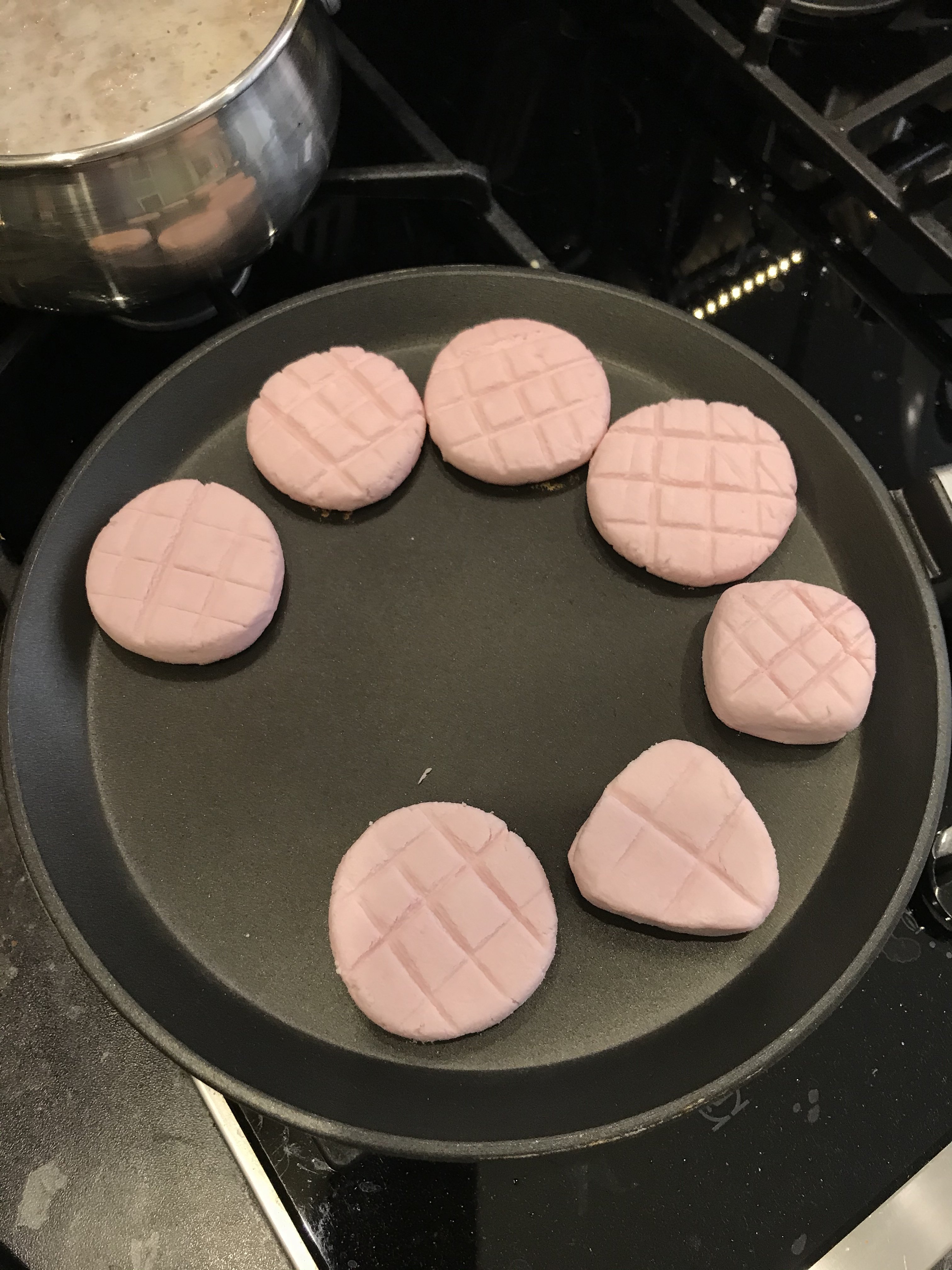Я познала рисовую муку, отличная тема!) Вот сырники с ней. Творог через сито, сахар и соль по вкусу и по желанию, рисовая мука, для цвета свекольный сок.
