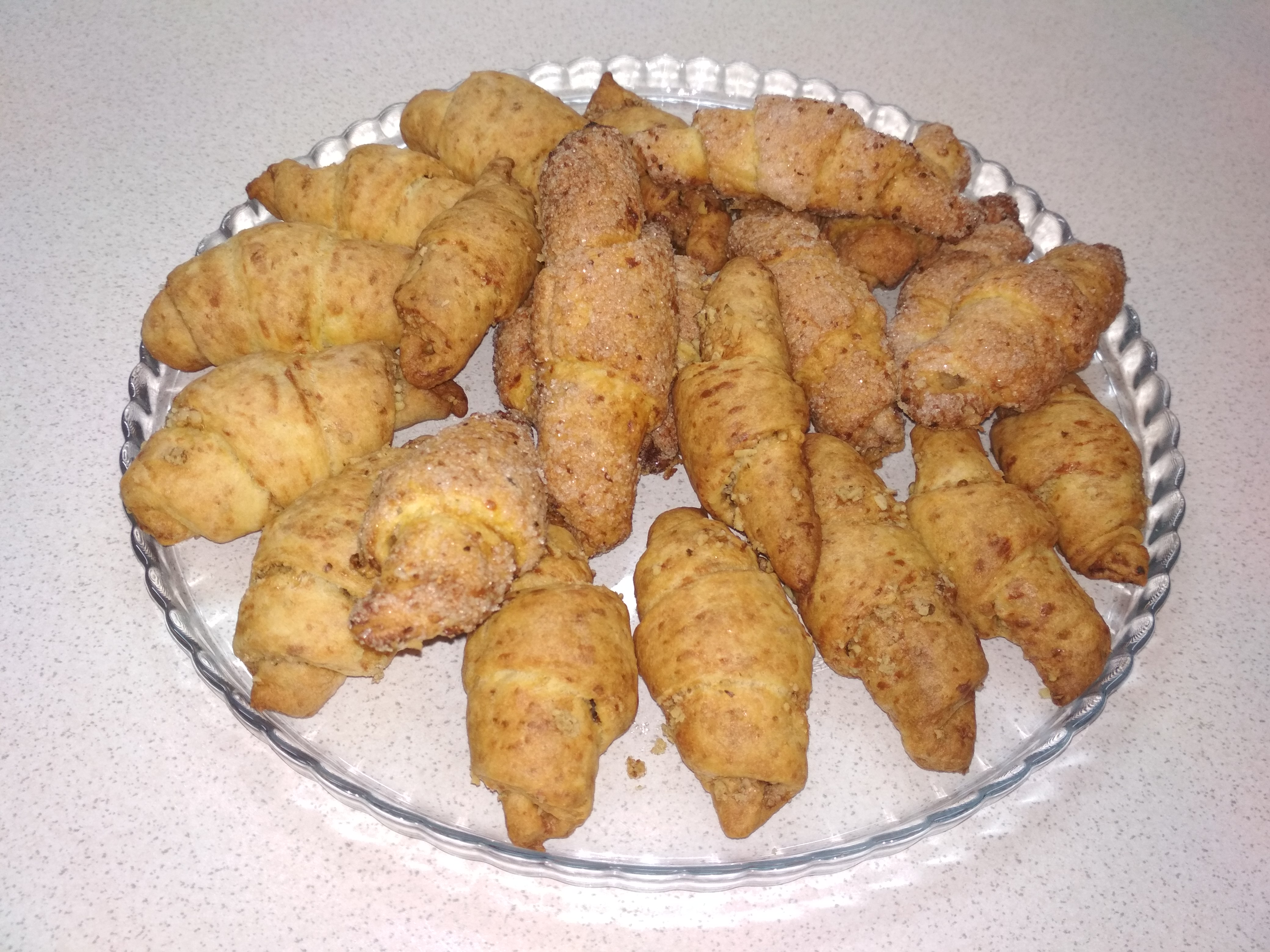 Решила сюда заплатить, всё же творог основной ингредиент. Творожные рогалики. Двух видов рогалики: просто с сахаром и молотый грецкий орех с сахаром и корицей заворачивала, как начинку. Готовила строго по рецепту, взятого из интернета, на классику не претендую!Мои в восторге!