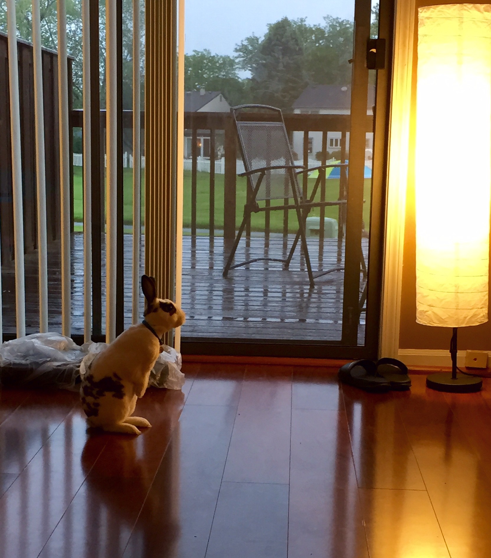 Собаки тоже кошек гоняют(чужих) Он у нас один раз увидел как курицу на банке готовят. Это был для него шок. С тех пор когда на кухне что готовится, кролика нет.