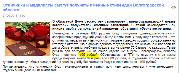 1100руб. и до 2008 ничего не значили, тем более в МСК и СПБ. Ежемесячно высылали ребенку n-сумму. Но вот в конце нулевых в ВУЗах появились индивидуальные стипендии, складывающиеся из суммы баллов по разным критериям - научная, культурная, общественная, спортивная деятельности. Хорошие добавки к стипендиям получались, дитенок по 13-15тыс. получал. Ну и индивидуальные стипендии никто не отменял - у нас год была от банка ВТБ именная стипендия, но она была скромненькая, по-моему, всего 2000. Правда, все эти стипендии имели к золотой медали уже весьма опосредованное отношение. Хотя... как знать... возможно, без той первой заслуженной медали, не было бы в последующем никаких именных стипендий, да много чего бы не было!