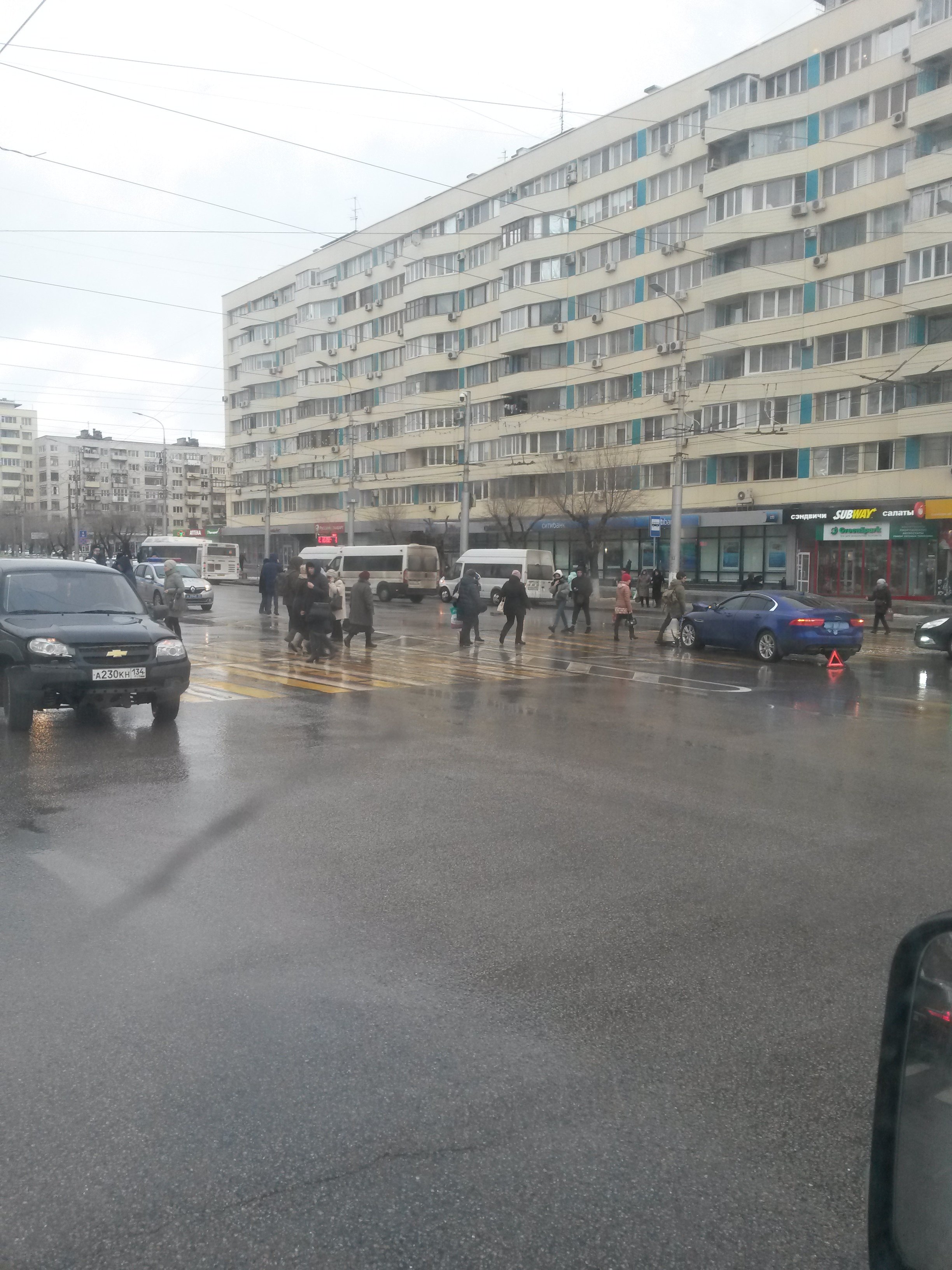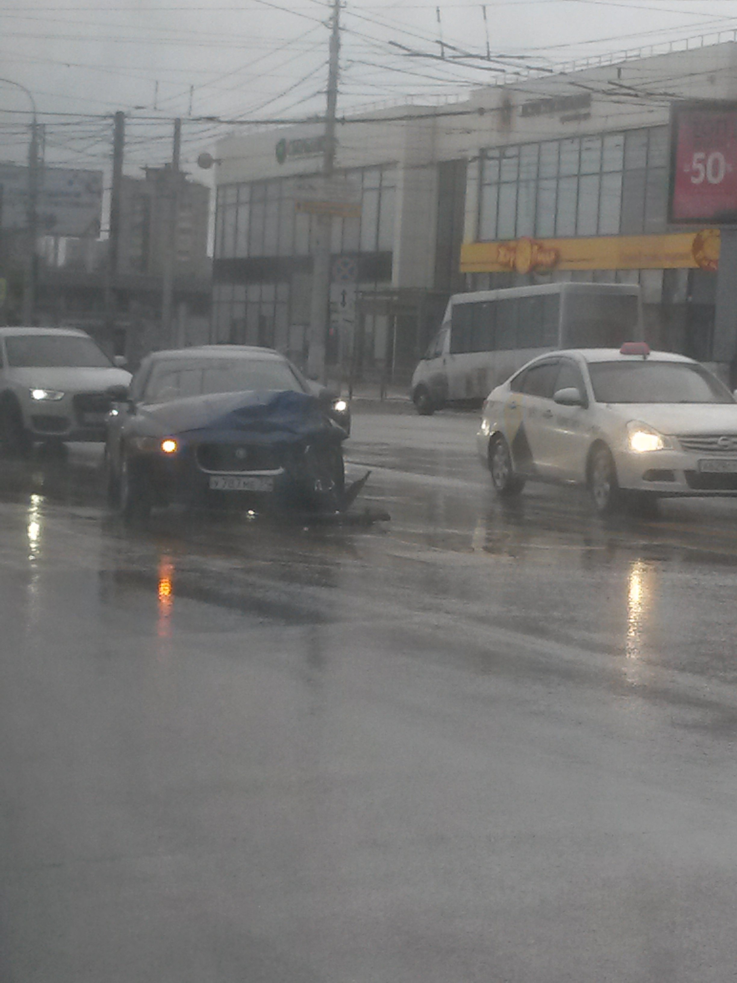 Тулаковский Ягуар. По мне - она виновата, там жена за рулем была, т.к. муж вышел с пассажирского. На видео видно, что они уже поехали на желтый. А там, чем черт не шутит. А вот сейчас товарищ прислал на 7-ми ветрах.