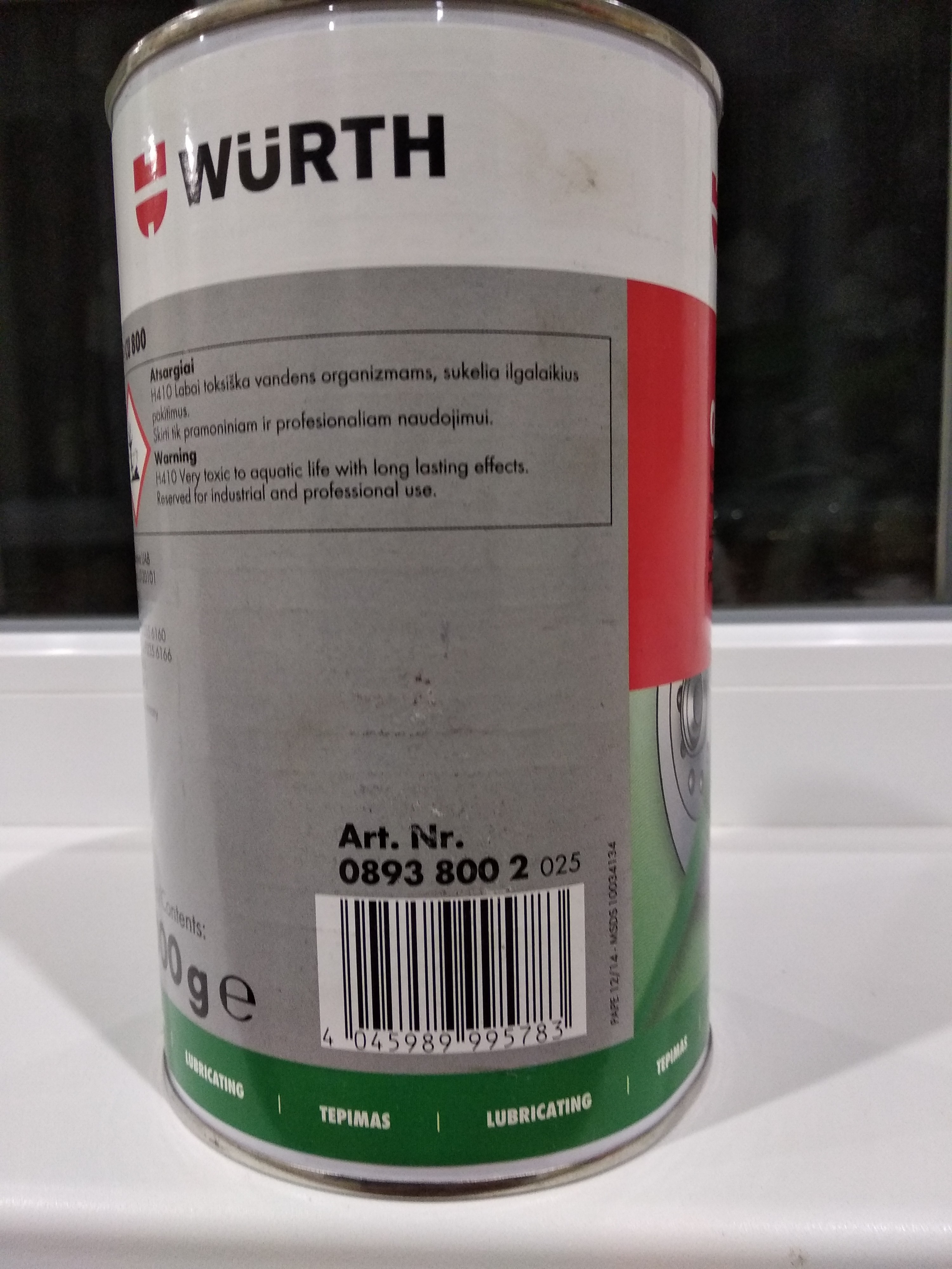 Упаковка 1 кг. Банка помятая . Видно на фото. Целостность тары не нарушена. Цена 3 150 руб. Медная паста CU 800 — Вюрт Маркет При покупке вместе с Продам смазку WGF 130. WURTH. скидка 7%. За два товара. Дополнительно при покупке вместе с Диски по металлу Wurth 125 мм. скидка 10%. За все три товара.