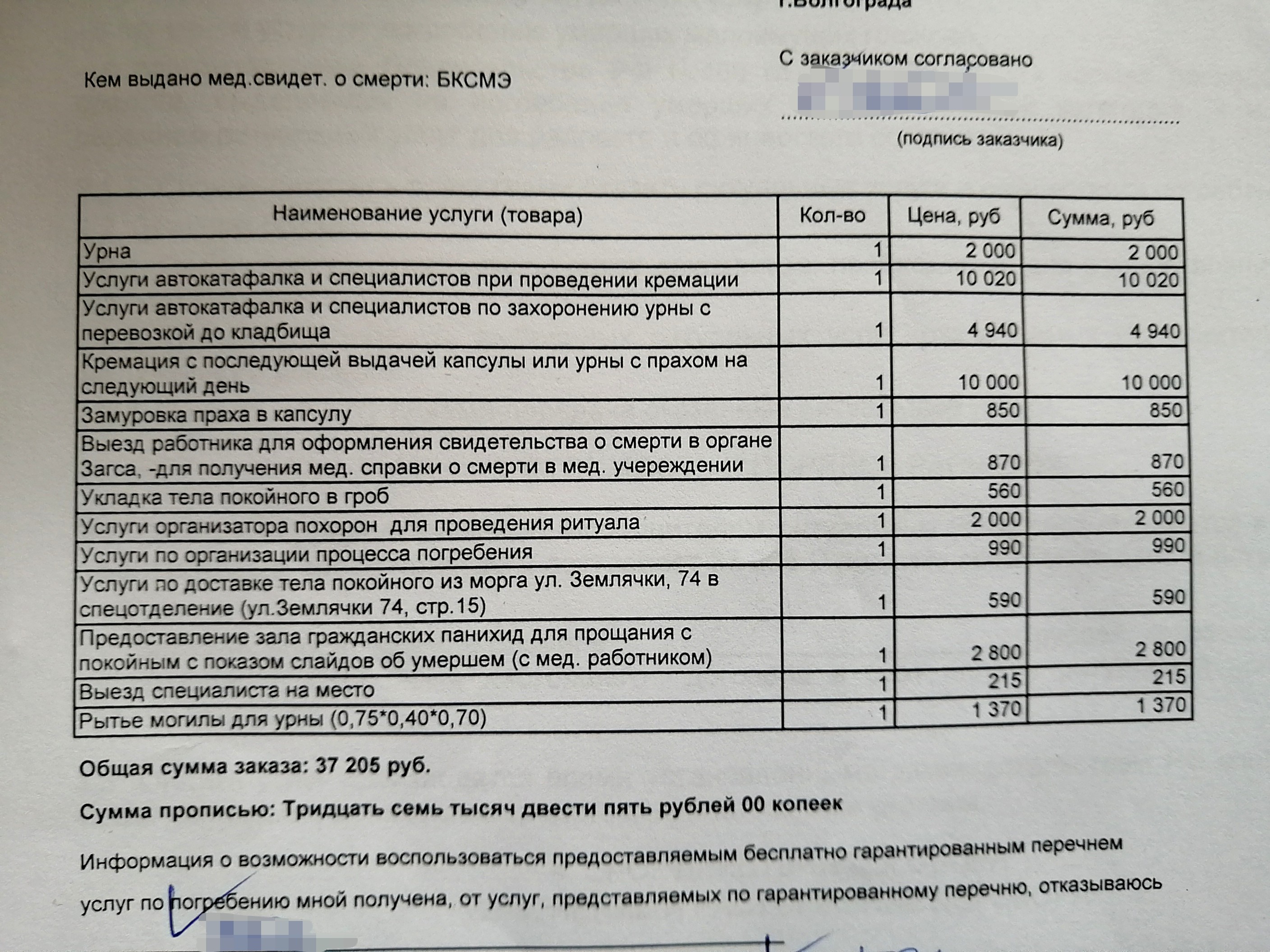 в начале наступившего года проходил данный квест: Насколько я понял из инетной инфы - обращаться напрямую на кладбище не вариант, поэтому поступил так: 1. Обращение (13.01)в офис "памяти" на центральном кладбище, без доков - с целью получить инфу: ответ самое раннее, когда можно будет похоронить 17,01 - нет катафалков, высокая загруженность. 2. Обращение (13.01) в офис "памяти" на Землячке. МалЧик, сразу с наездом "почему не позвонили" (фельшер скорой /который засвидетельствовал факт смерти/ "предлагает" сразу номер телефона), нужно же скорее нам забрать тело (смерть дома), подготовить. Я отвечаю, ничего забирать не надо, хоронить будем из дома, там родственники ужЕ прощаются, всё ужЕ подготовлено. Нужно только похоронить. Он: "так не делается, нужно за забальзамировать тело и т.д. где вы его будете держать, самое раннее похоронить можно 17.01, сейчас ребята съездят, заберут, привезут...." и хватает паспорт ищет прописку (прописка не городская). Я говорю: "никого отправлять не надо, забирать не надо, там сейчас родственники прощаются", он продолжает настаивать, я ЗАБИРАЮ ПАСПОРТА и говорю "ТОГДА МЫ БУДЕМ ХОРОНИТЬ В ДРУГОМ ГОРОДЕ". Он отвечает "вы определитесь где хотите хоронить". Я отвечаю: "В Волгограде, но если это так долго и нельзя из дома, тогда в другом городе". Он: "Ну давайте пройдём к менеджеру, подождите". Приходит барышня "менеджер" вы хотите из дома хоронить? а на каком кладбище (насколько я понял первичное захоронение сейчас либо на Селезнёвке, либо на новом Ворошиловском (красноармейский не беру в расчёт). Я отвечаю на новом Ворошиловском. она: "хорошо, я сейчас позвоню а кладбище, выясню, вы ж понимаете нужно время подготовить могилу, минимум 11 часов на это. Кладбище работает до 16:00." Через некоторое время возвращается и говорит: есть два варианта 14.01 в 16:00, или 15.01 утром когда вы желаете?. Я говорю 14:01 вечером. Она пошла со словами: "Сейчас ещё уточню". Вернулась: 14.01 не успевают на 15 в 9:00 устроит? я соглашеюсь после этого с МалЧиком начинаем оформление. 3. Заполнил "Заявление на захоронение в соответствии со свидетельским волеизъявлением (прижизненным) о достойном отношении к телу и памяти после смерти" 4. МалЧик озвучил (цены по памяти, могу ошибаться): 4.1 Катафалк и команда из 4 человек 15000р (по счёту 14000 вроде 7000 катафалк + 7000 "команда") 4.2 Подъём гроба если нет грузового лифта - 160 рублей этаж 4.3 Спуск гроба с телом - 320 р. этаж 4.4 Укладка тела в гроб - 630 р 4.5 Подготовка могилы - 10000р это услуги "памяти" + услуги, которые оплатите непосредственно на кладбище + заказная продукция: 4.6 гроб - от 7000р (в магазине на ангарской 17 /не память/ - от 4,5 т.р. В принципе для желающих сэконимить можно самим купить гроб, поднять, уложить, а заказывать только вывоз и захоронение, я так прикидываю, после того как прошёл всю процедуру. Плюсом в данном случае, что тело будет до похорон лежать в гробу, и родственники спокойно могут приезжать и прощаться дома до дня похорон, но это если тело удалось "не отдать" ибо фельшер пишет что нужно вскрытие в морге, и по слухам всех стараются забрать в морг, даже если смерть на дому и не криминальная. Если получится получить справку о смерти в поликлинике /нам удалось/ тогда можно не возить, иначе выдаёт морг эту справку). 4.7 в гроб подушка, покрывало -2,5 т.р 4.8 в гроб впитывающие подкладка + пелёнка - около 500р 4.9 крест - от 3 или 3,5 т.р 4.10 венки от 500 р. 4.11 лента с подписью на в